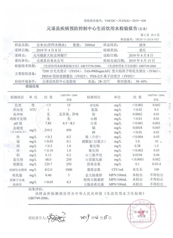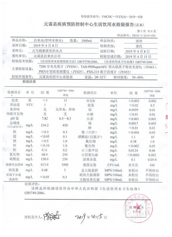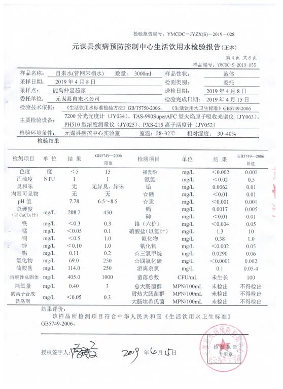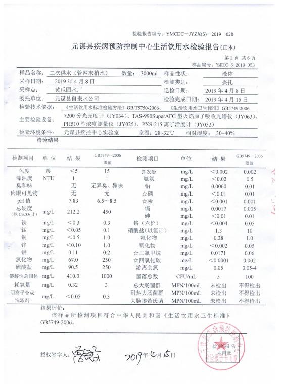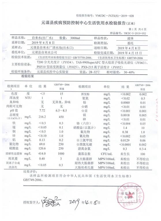 为响应广大人民群众要求,让群众喝上放心水、明白水,并接受社会监督,现将我公司委托元谋县疾病预防控制中心监测检验的2019年4月自来水供水水质检测结果公告如下: