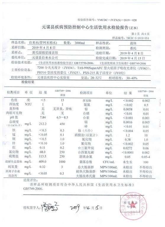 疾病预防控制中心分别对自来水厂清水池、黄瓜园供水站、黄瓜园镇星缘宾馆、能禹仲显茹家、元马镇紫溪苑供水点、新大街志鸿餐厅的管网末梢水进行了抽检。经检测,以上六组水样的色度、菌落总数、浑浊度、总大肠菌群、耐热大肠菌群、大肠埃希氏菌、臭和味、游离余氯、肉眼可见物、PH值、总硬度、铁、锰、铜、锌、铝、氯化物、硫酸盐、溶解性总固体、耗氧量、阴离子合成洗涤剂、挥发酚、氨氮、铅、硒、汞、镉、砷、铬、硝酸盐、氟化物、氰化物、三氯甲烷、四氯化碳等35项常规检测指标均控制在国家规定安全限值范围内。所测水样水质符合GB5749-2006国家生活饮用水卫生标准。