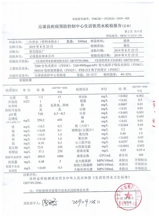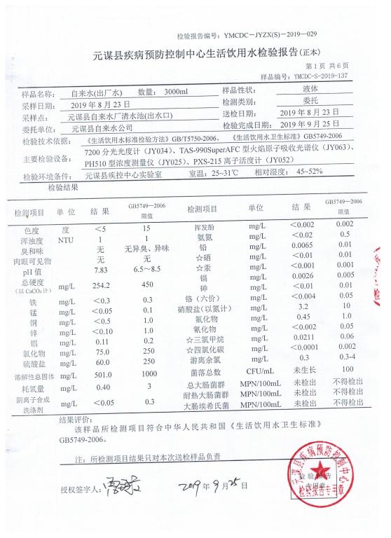 为响应广大人民群众要求,让群众喝上放心水、明白水,并接受社会监督,现将我公司委托元谋县疾病预防控制中心监测检验的2019年8月自来水供水水质检测结果公告如下: