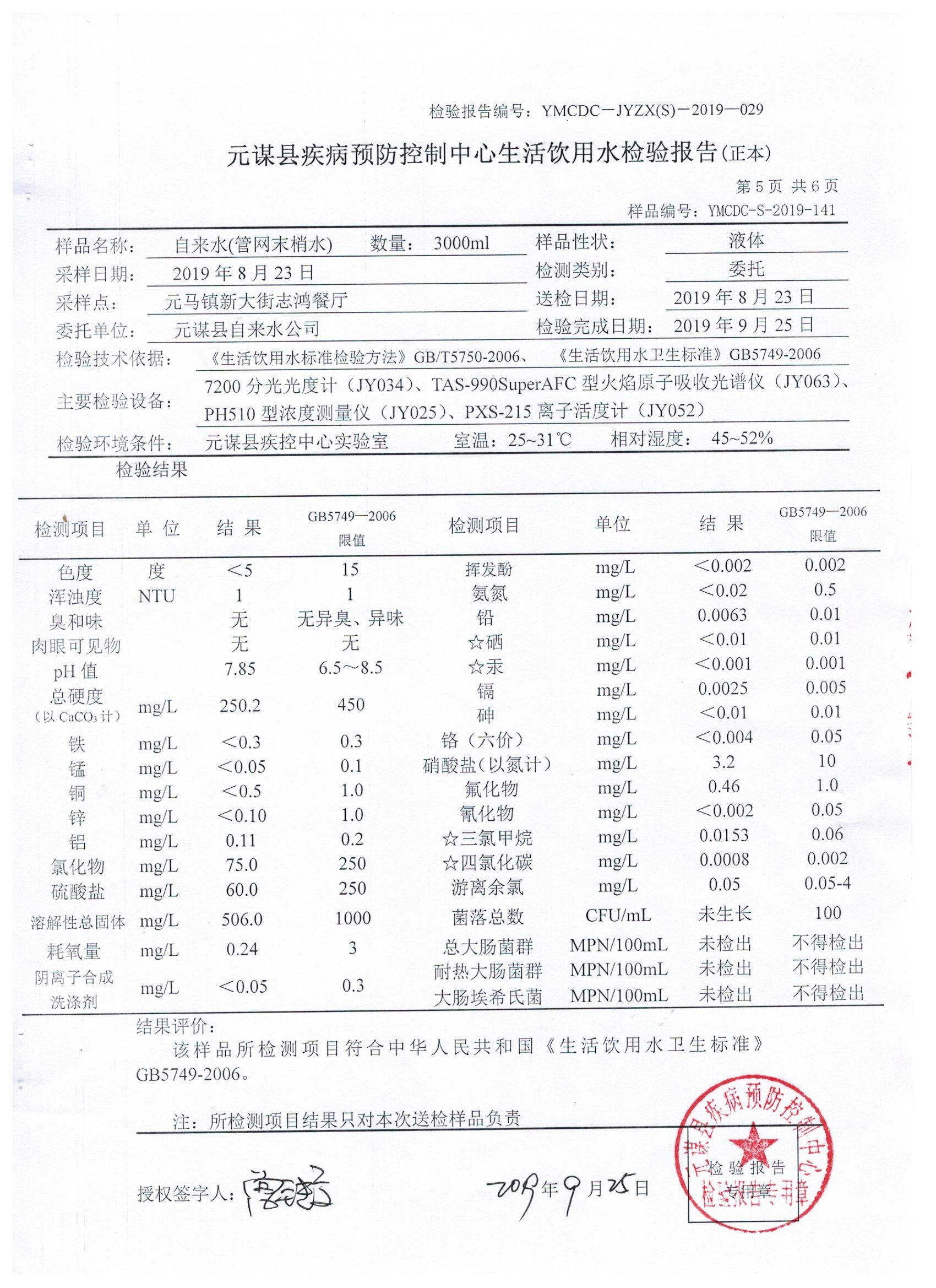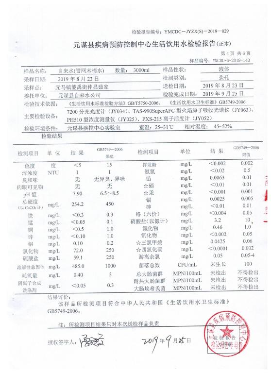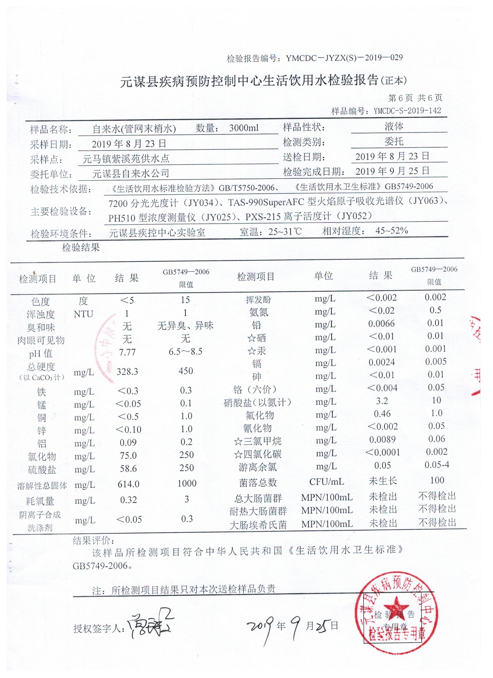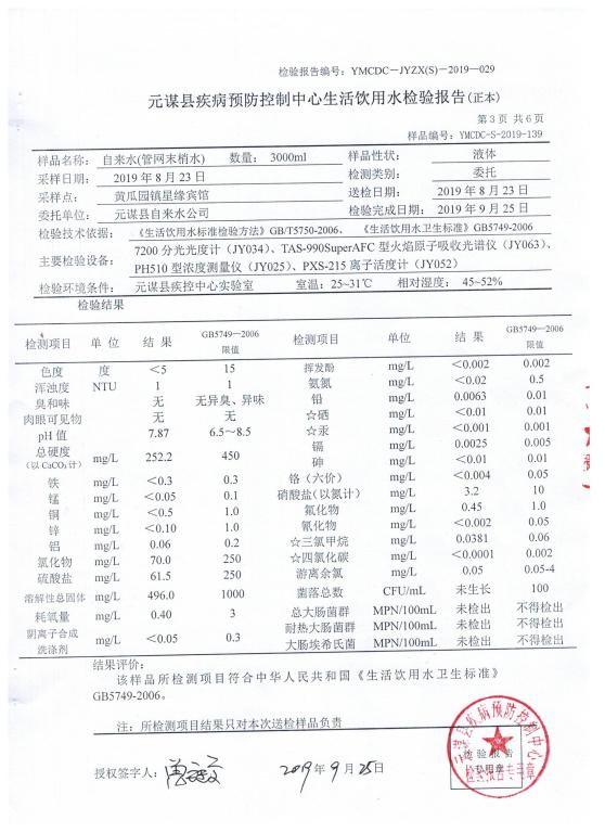 疾病预防控制中心分别对自来水厂清水池(出水口)、黄瓜园水厂、黄瓜园镇星缘宾馆、元马镇能禹街仲显茹家、元马镇新大街志鸿餐厅、元马镇紫溪苑供水点进行了抽检。经检测,以上六组水样的色度、菌落总数、浑浊度、总大肠菌群、耐热大肠菌群、大肠埃希氏菌、臭和味、游离余氯、肉眼可见物、PH值、总硬度、铁、锰、铜、锌、铝、氯化物、硫酸盐、溶解性总固体、耗氧量、阴离子合成洗涤剂、挥发酚、氨氮、铅、硒、汞、镉、砷、铬、硝酸盐、氟化物、氰化物、三氯甲烷、四氯化碳等34项常规检测指标均控制在国家规定安全限值范围内。所测水样水质符合GB5749-2006国家生活饮用水卫生标准。