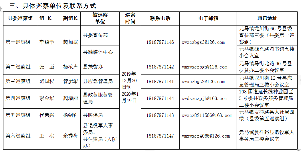按照县委统一部署,县委第十一轮巡察6个巡察组从2019年12月20日开始,分别进驻县委宣传部、县融媒体中心、县扶贫办、县应急管理局、县政务服务管理局、县医保局、县退役军人事务局7家单位开展常规巡察,进驻县住建局(人防办)开展人防系统机动巡察。现将有关情况公告如下:
