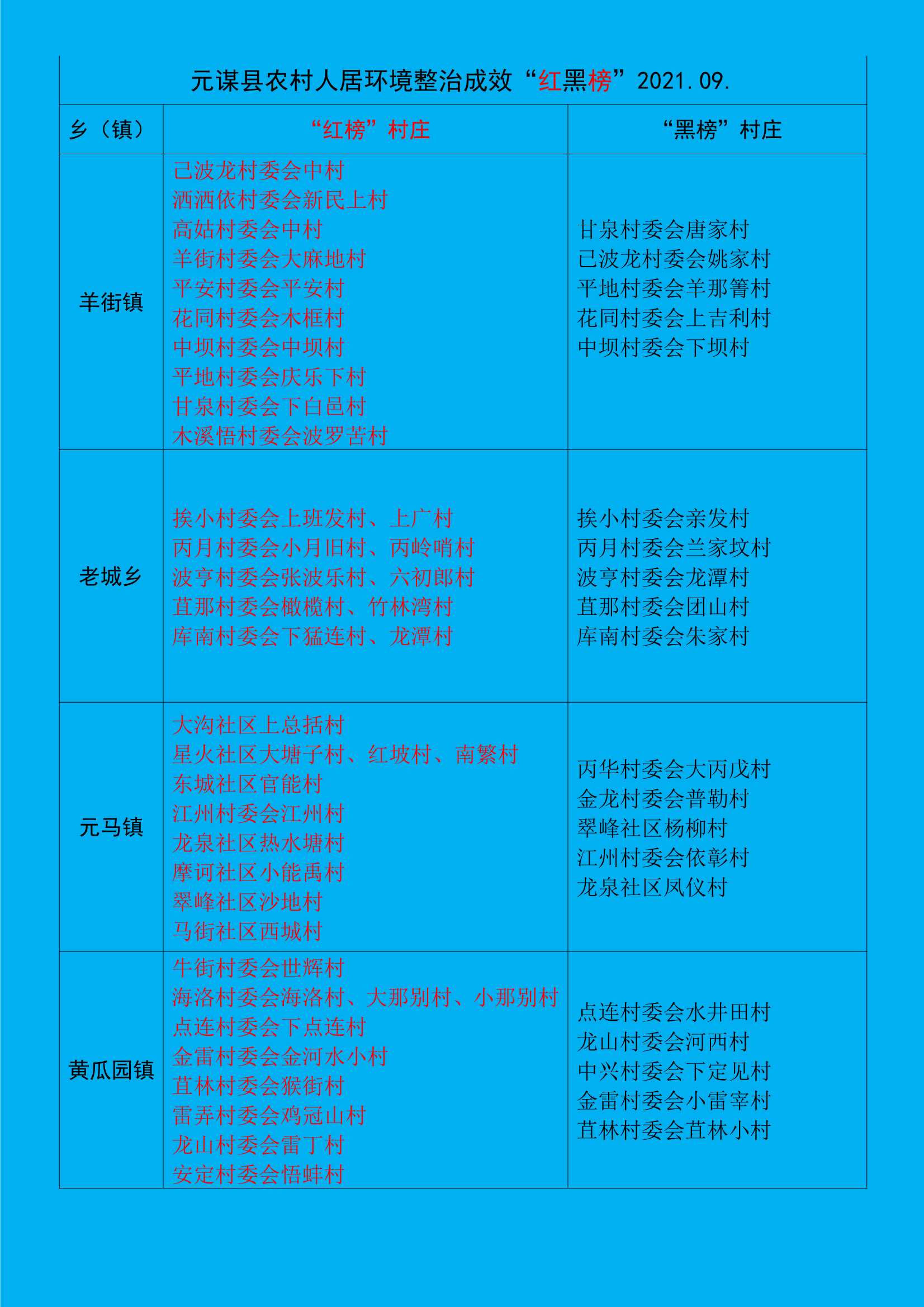 为深入贯彻落实党中央、国务院关于农村人居环境整治的决策部署,以正面激励与反面警示相结合的方式,宣传表彰先进、鞭策督促后进,进一步激发群众参与环境整治的内生动力,持续巩固提升整治成效,改变农民群众不良生活习惯,形成积极向上的新风尚,提高农民群众的获得感、幸福感。元谋县立足农村人居环境一档村庄八条标准,建立了农村人居环境整治成效“红黑榜”制度,对全县所有自然村进行评定打分,定期进行发布。农村人居环境整治工作做得好的村庄进入“红榜”,做得差的村庄列入“黑榜”,并对红榜村适时进行通报表彰,对黑榜村及时进行督促整改。以下是2021年9月入榜村庄,看看你的家乡是否榜上有名?