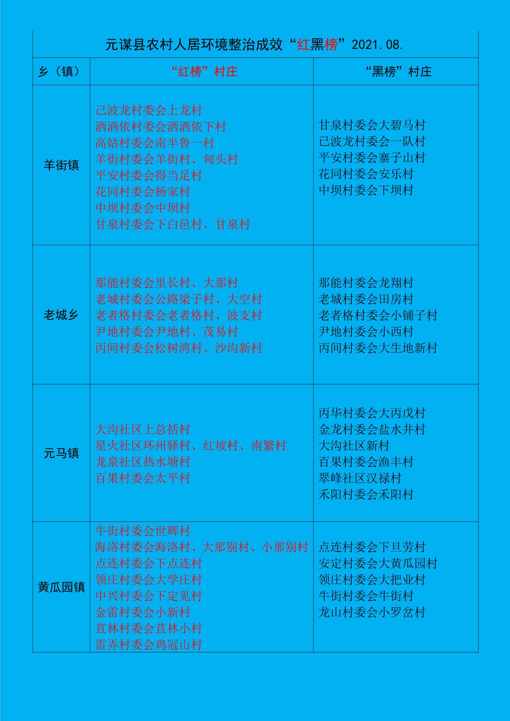 为深入贯彻落实党中央、国务院关于农村人居环境整治的决策部署,以正面激励与反面警示相结合的方式,宣传表彰先进、鞭策督促后进,进一步激发群众参与环境整治的内生动力,持续巩固提升整治成效,改变农民群众不良生活习惯,形成积极向上的新风尚,提高农民群众的获得感、幸福感。元谋县立足农村人居环境一档村庄八条标准,建立了农村人居环境整治成效“红黑榜”制度,对全县所有自然村进行评定打分,定期进行发布。农村人居环境整治工作做得好的村庄进入“红榜”,做得差的村庄列入“黑榜”,并对红榜村适时进行通报表彰,对黑榜村及时进行督促整改。以下是2021年8月入榜村庄,看看你的家乡是否榜上有名?
