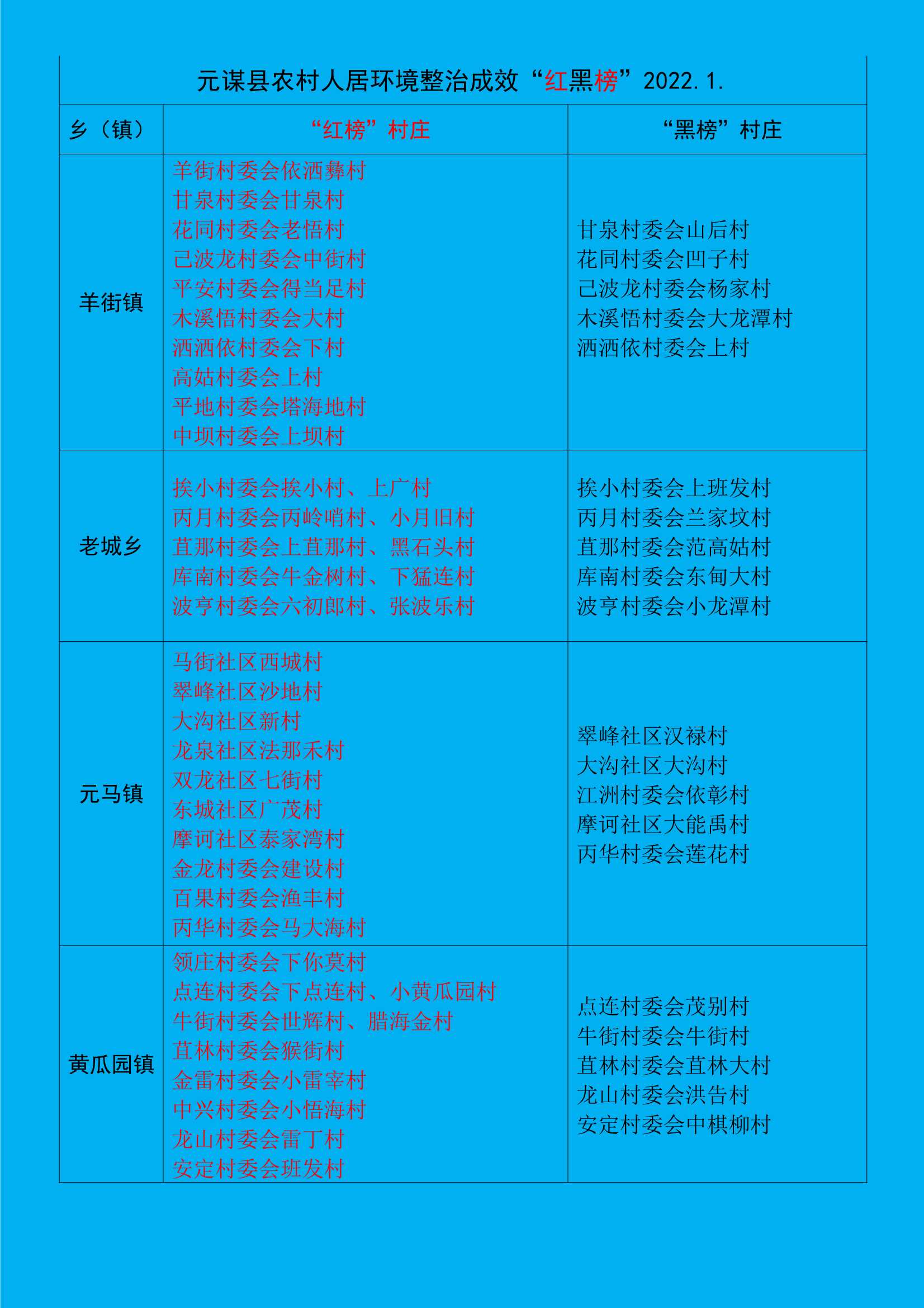为深入贯彻落实党中央、国务院关于农村人居环境整治的决策部署,以正面激励与反面警示相结合的方式,宣传表彰先进、鞭策督促后进,进一步激发群众参与环境整治的内生动力,持续巩固提升整治成效,改变农民群众不良生活习惯,形成积极向上的新风尚,提高农民群众的获得感、幸福感。元谋县立足农村人居环境一档村庄八条标准,建立了农村人居环境整治成效“红黑榜”制度,对全县所有自然村进行评定打分,定期进行发布。农村人居环境整治工作做得好的村庄进入“红榜”,做得差的村庄列入“黑榜”,并对红榜村适时进行通报表彰,对黑榜村及时进行督促整改。以下是2022年1月入榜村庄,快来看看你的家乡上的是什么榜?