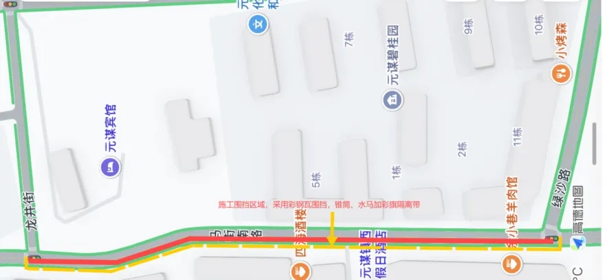 三、施工方式:龙井街与马街南路交叉口至绿沙路与马街南路交叉口段道路采取半幅封闭施工方式,施工期间道路保持半幅交通正常通行;