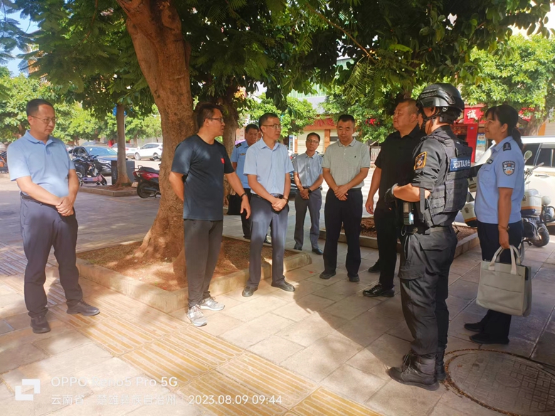 2023年8月9日上午,元谋县委书记刘文跃,县委副书记、县长王开国带领县委常委、县委办主任杨金祥,县人民政府副县长、县公安局党委书记、局长李绍宁,县公安局党委副书记、政委朱德刚,县应急管理局党委书记、局长李建勇等一行8人到元谋县公安局飞马巡特警大队执勤点开展检查指导工作,元谋县公安局党委委员、副局长杨丽琼陪同检查。