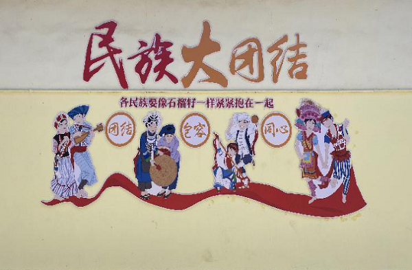 强化宣传力度,营造民族团结氛围。在腊海金村主干道以墙体彩绘的形式展现民族团结及中华传统文化,让各族群众每天都能看到,在潜移默化中牢固树立各民族相互之间休戚与共、荣辱与共、生死与共、命运与共的共同体理念,铸牢中华民族共同体意识。同时利用醒目的电子显示屏,滚动播放民族团结宣传标语,使人民群众随时随地都能接受到最全面、最及时、最快捷的民族知识,为“民族团结”宣传活动创造良好的氛围,让中华传统文化和中华民族共同体意识入脑入心。