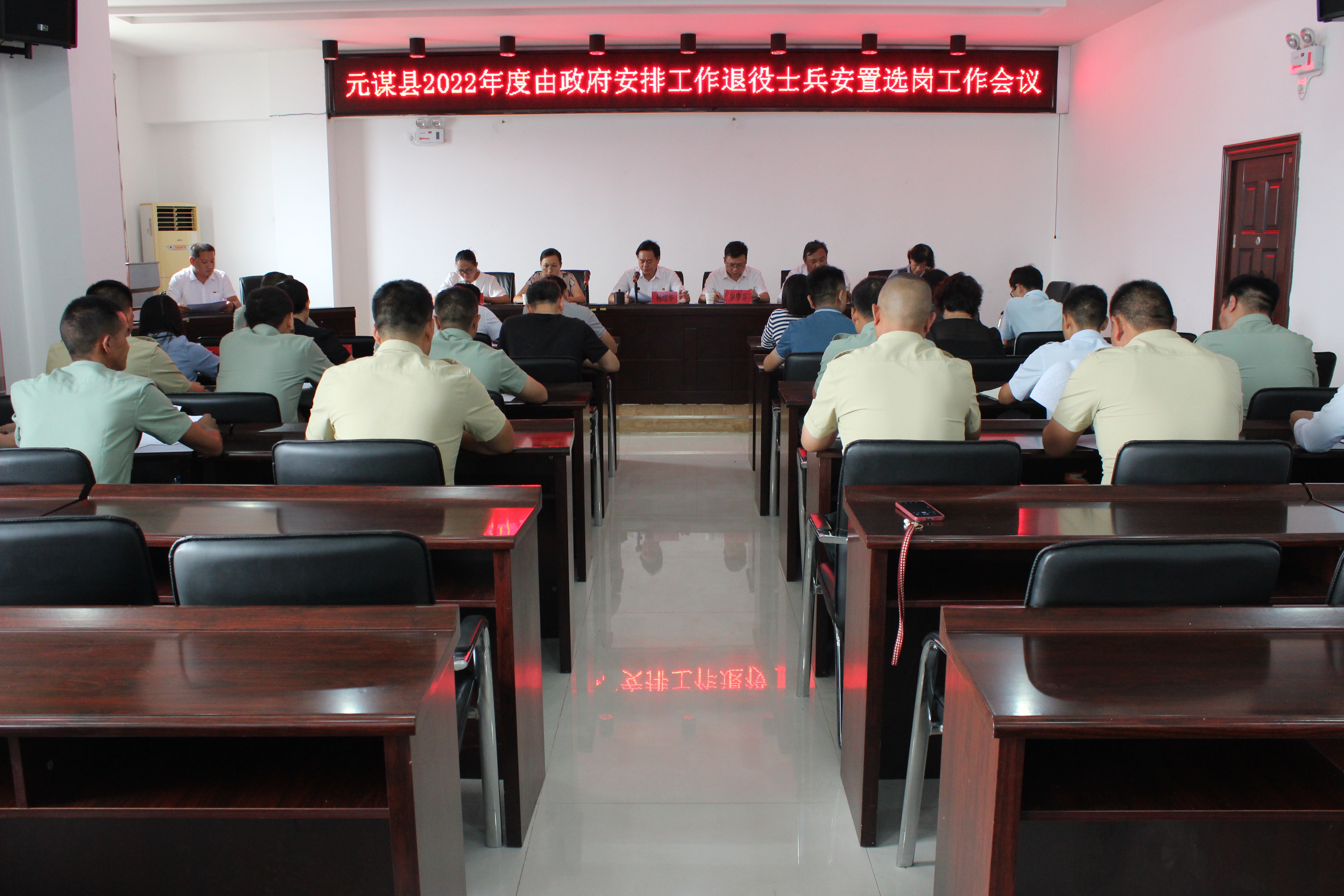 8月16日,元谋县召开2022年度由政府安排工作退役士兵安置选岗工作会议。县委编办、县人社局、派驻纪检监察组、县退役军人事务局和11家接收安置退役士兵单位分管人事工作的领导以及12名符合安置条件的退役士兵参加了会议。