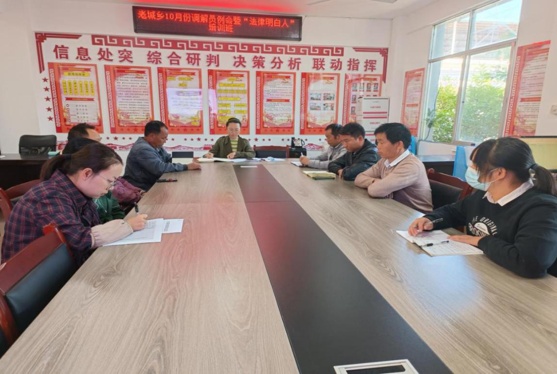 2022年10月20日,老城司法所联合乡综治中心组织老城乡10个村委会的专职治保调解员召开10月份调解员例会暨“法律明白人”培训班会议。