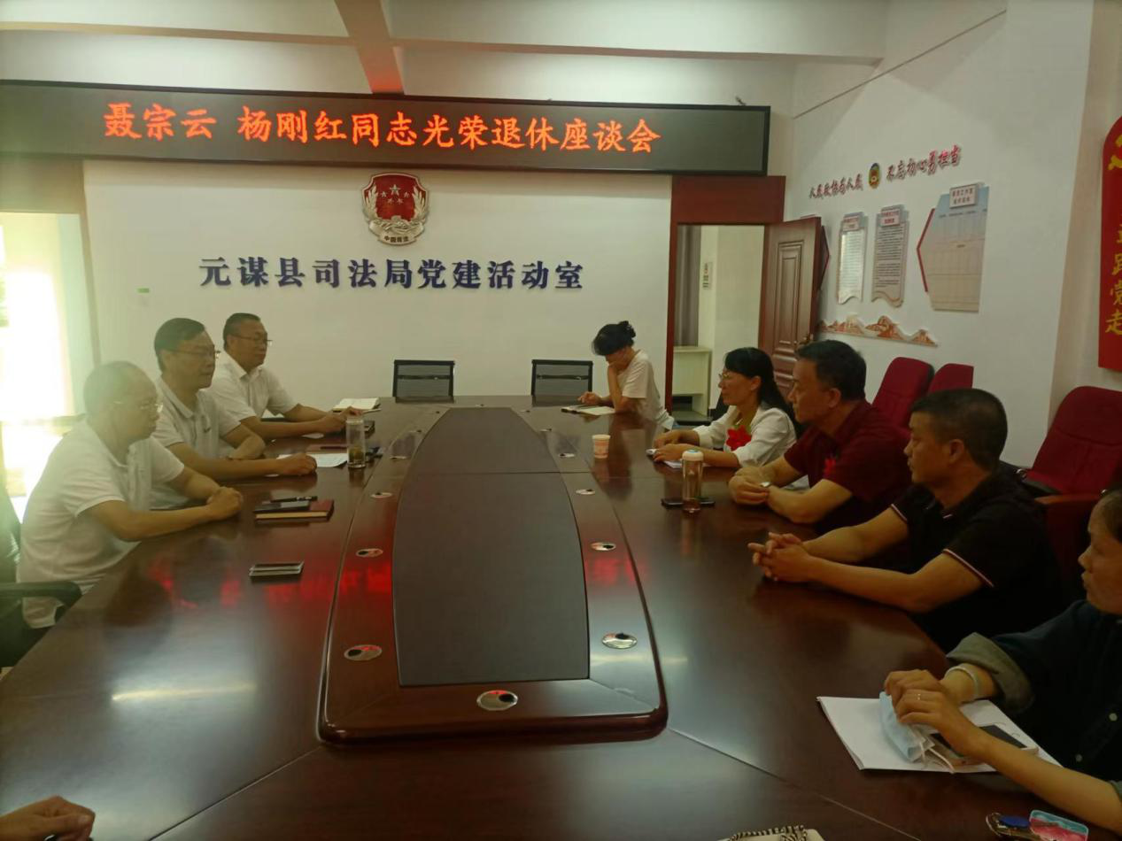 来时风华正茂,归时已生华发。10月28日下午,元谋县司法局举行了简单而又温馨的干部光荣退休座谈会,以最真挚的情谊欢送聂宗云、杨刚红两位同志光荣退休。局领导班子成员、各股室(中心、处)负责人参加座谈会。