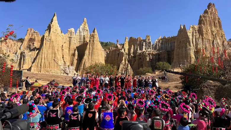 2023年1月5日下午中央广播电视总台《民歌·中国》春节特别节目《我的家乡我的年》在元谋县新华乡浪巴铺土林景区录制,有200余名群众参与了此次活动。元谋县公安局高度重视,统筹组织县局值班组、交警大队、飞马特警大队、新华派出所及新华乡党委政府相关工作人员圆满完成此次安保任务,得到了在场观众和各级领导的一致好评。