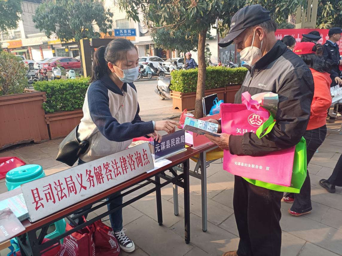阳春三月,春风送暖。为进一步强化对妇女的法治宣传和维权服务,不断增强妇女的法治意识,切实维护广大妇女的合法权益。3月5日上午,元谋县司法局联合县妇联、县法院、县教育体育局、县公安局等单位在县电信小广场集中开展“三八”维权月暨“建设法治元谋.巾帼在行动”法治宣传活动,为广大妇女群众送上一份“法治大餐”,为我县普法强基补短板专项行动再添新动能。