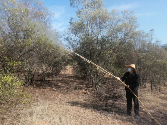 在元谋人遗址防治现场,县林草局的工作人员各司其职、各负其责,熟练地给树木喷洒着农药。他们不怕风吹日晒,有的驾驶着车辆,有的在配制着农药、有的正手持药具,山坡上到处是忙碌景象。