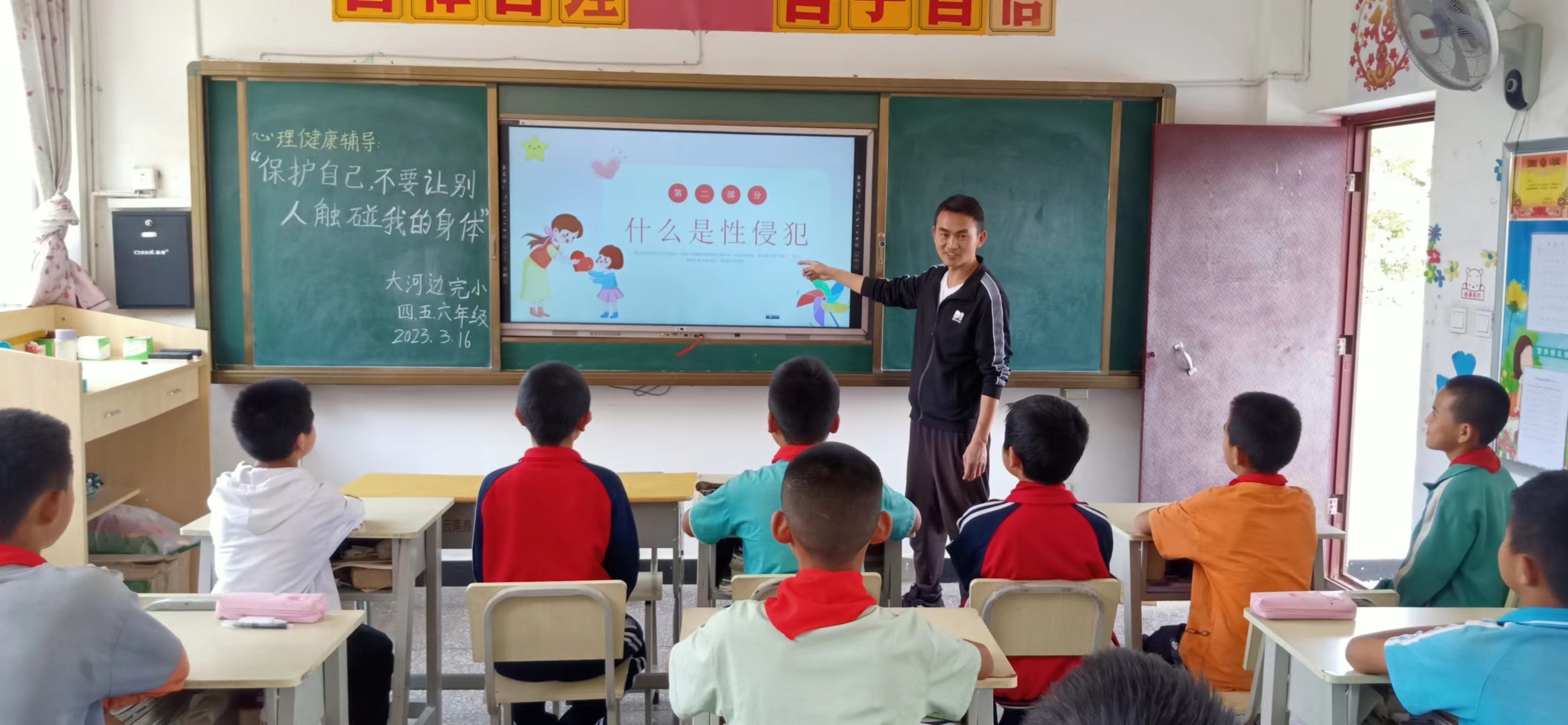 在大河边完小校点,校长和少先队辅导员廖老师的讲座现场,女生和男生们也听得全神贯注。为了提高孩子们的预防性侵意识,张校长在精心预设了各类情景问题的同时,制作生动有趣的课件,由游戏进入,故事导入,将防性侵的知识装入学生的脑中、心中。
