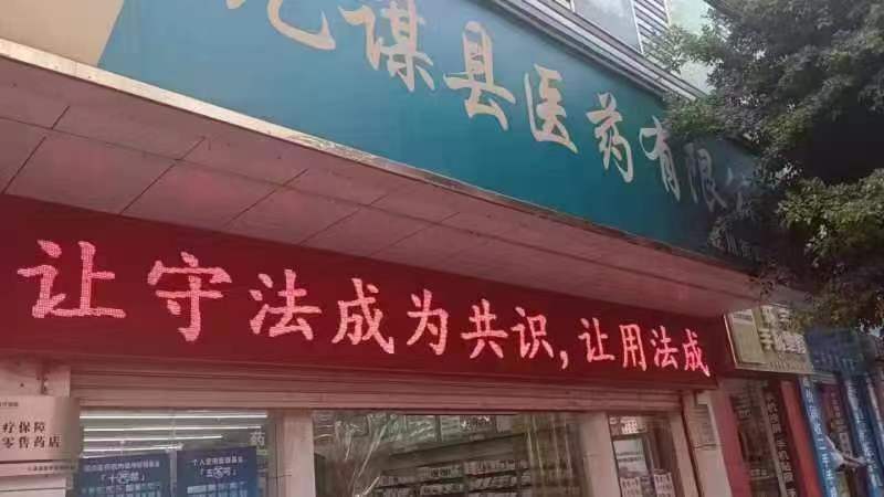 普法强基补短板专项行动作为全面依法治国的基础性工作,关系党执政兴国,关系人民幸福安康,关系党和国家长治久安。为营造学法氛围,我单位开展了一系列工作。一是在单位办公楼电子显示屏全天滚动播出2023年普法强基补短板专项行动法治宣传标语口号,让全体干部职工及来往办事人员、群众可见,让普法入心入脑。二是积极组织规模以上企业宣传普法知识,营造法律宣传氛围。元谋县医药有限公司在药店门市电子显示屏全天播放宣传标语口号,营造普法氛围,让过往群众知晓可见,让尊法成为信仰,让学法成为自觉,让守法成为共识,让用法成为习惯,弘扬法治精神,提升法治素养,建设更高水平平安元谋,法治元谋。