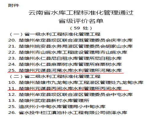 经过省级专家综合评价,2023年11月,河尾水库被评价为省一级水利工程标准化管理工程,丙间中型水库被评价为省二级水利工程标准化管理工程。河尾、丙间水库作为全县率先通过省级水利工程标准化管理的水库项目,为元谋县水利工程标准化管理创建起到了示范作用。