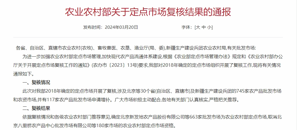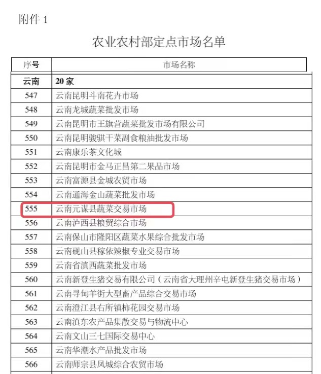 近期,农业农村部对定点市场复核结果进行通报,元谋县蔬菜交易市场顺利通过定点市场复核。本次复核工作是农业农村部对2018年确定的定点市场进行复核。经市场主体自愿申请、县市省三级农业农村部门逐级核实、部级复核确认,共有663家市场主体符合标准确定为定点市场,180家不符合标准取消定点市场资格。