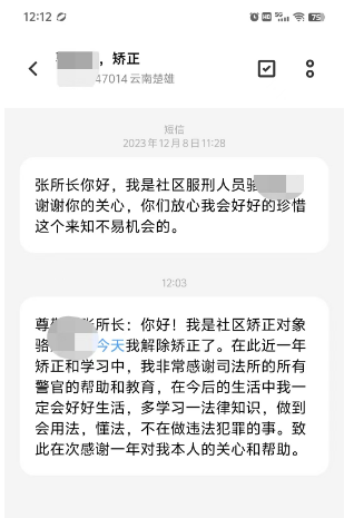 近日,元谋县司法局黄瓜园司法所收到假释解矫人员骆某的感谢短信。短信虽短,但分量很重。
