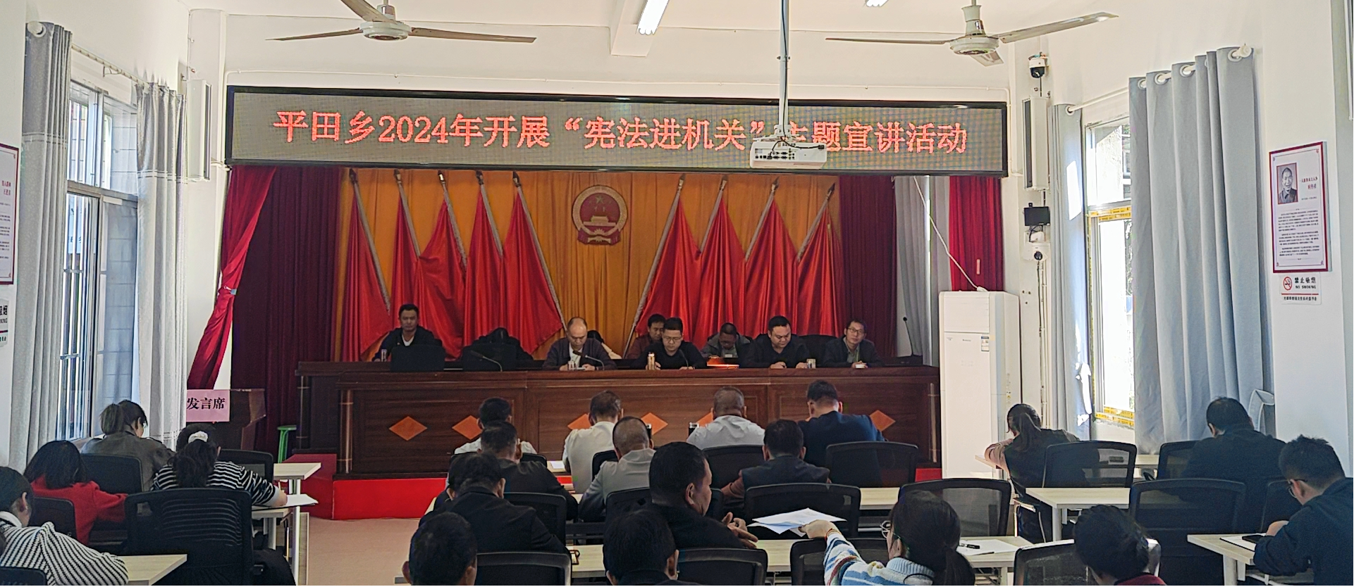 宪法进机关,加强法治再教育。依托平田乡“书香平田”读书班活动,各村委会组织开展以《中华人民共和国宪法》学习为主题的法治宣讲课,围绕“宪法是什么、宪法的本质特征、现行宪法的主要内容”三个方面,让干部职工深入学习了解宪法的精神实质、核心要义,以及尊崇宪法、学习宪法的重要性。有效地提升干部职工牢固树立宪法意识,在学习宪法的基础上立足岗位工作实际,依法依规履职尽责,不断增强恪守宪法原则、遵宪守法意识的自觉性和坚定性。