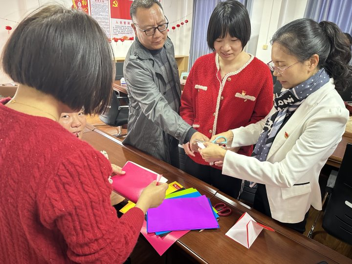 现场还有剪窗花活动。大家围着剪纸能手,学着老师的动作,有模有样地精心绘图、设计、裁剪,一边交流剪窗花的技巧,一边分享元宵节的趣事。不一会儿,一张张彩纸在他们的翻转、舞动下变成形态各异、栩栩如生的精美窗花。