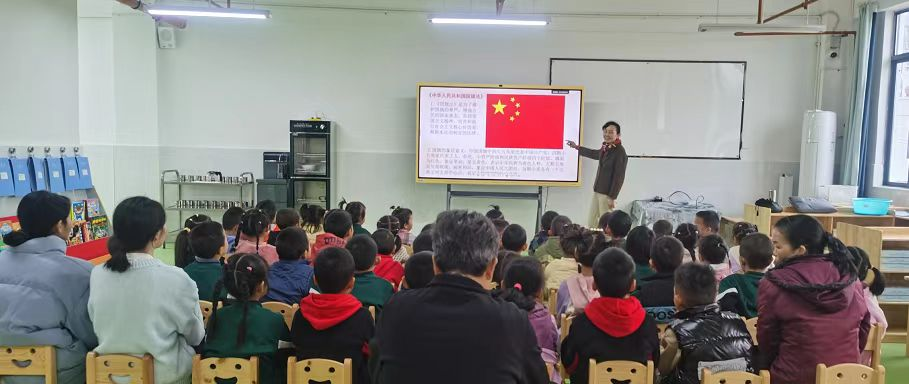 二是开展“法治安全教育小课堂”。课堂上带领小朋友们学习《中华人民共和国国旗法》《中华人民共和国国歌法》《中华人民共和国国徽法》等相关法律知识。带着小朋友们一起唱国歌,从小培养小朋友们尊重和维护国旗、国徽、国歌的自觉性和法律意识,厚植爱国情怀。通过互动的方式,和小朋友们一起辨认了灭火器、安全疏散标识、交通信号灯、斑马线。还重点强调了不吃陌生人给的东西,不和陌生人单独相处等安全小知识。