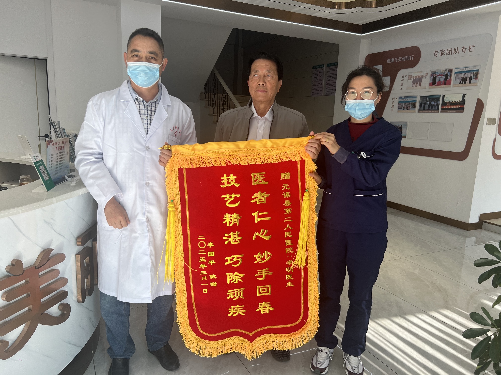 患者李先生长期受到面部肿物增大及泛发性湿疹的困扰,曾到多家医院求医,但效果不明显,病情反复让他备受困扰。去年一次偶然的机会,他来到元马镇卫生院皮肤科就诊,李明医生接诊,详细询问病史,耐心分析病情,并结合中西医治疗特色为他量身定制了个性化的诊疗方案。经过治疗,周先生的肿物得以切除并且皮肤状况明显改善,病情得到有效控制。这让他切实感受到了优质医疗服务带来的温暖和希望,并对李医生的技术及团队的服务态度许予高度评价,因此特意送来锦旗,以表达他对李医生的由衷感谢。