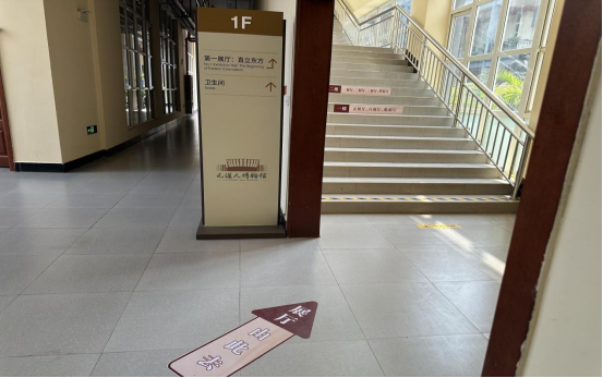 并且,做到了指示牌全覆盖。从博物馆的入口开始,一系列引导类指示牌就为观众指引方向。这些指示牌采用清晰的图标和简洁的文字,标明了展厅、卫生间、休息区等重要区域的位置。在楼梯等容易让人迷失方向的地方,同样设置了指示牌与地标,帮助观众快速找到自己的目的地。
