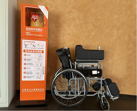 进入博物馆,显眼处设置了AED设备。AED的配备为应对突发健康危机提供了“黄金保障”,工作人员还定期接受急救培训,确保在紧急时刻能迅速、有效地开展救援,为观众的生命安全筑牢防线。紧邻入口的便民服务柜陈列着各类实用物品,包括急救物资、工具箱、针线盒等,前台还放置了共享充电宝,一应设施均可解决观众参观时的突发需求。馆内还开辟了宽敞的行李寄存区,提供免费寄存服务,确保观众参观体验。为保障特殊群体的参观权益,元谋人博物馆还配备了轮椅,并在入馆处铺设了无障碍通道。在公共区域还放置了饮水机,方便观众随时饮用。同时,休息座椅数量大幅增加,位置布局更为合理,让观众在参观之余能获得舒适的休息体验。