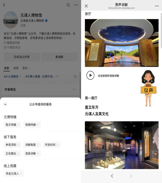 此外,为了满足观众随时随地获取信息的需求,还搭建了线上咨询平台。观众只需扫码关注元谋人博物馆微信公众号,就能获取诸多信息,例如博物馆开放时间、博物馆参观须知、博物馆讲解制度、线上展览、活动咨询以及语音讲解服务等。还运用“一部手机游云南”平台,推出了扫码听讲解等一系列便民服务,让观众获得更轻松、便捷、智能的参观体验。
