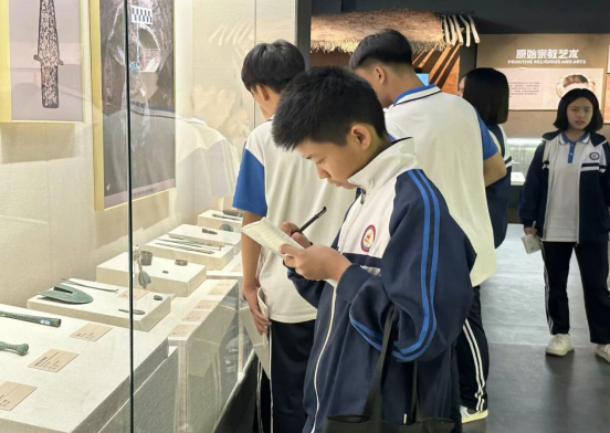 同学们跟随讲解员老师,有秩序地参观着博物馆的各个展厅。步入展馆,同学们认真聆听,沉浸在历史的长河中,感受着每一件文物背后蕴含的历史故事和艺术价值。他们兴致勃勃地欣赏着、小声交流讨论着,在笔记本上记下学到的知识。