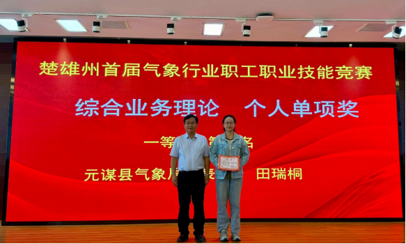 4月22至25日,由楚雄州气象局、楚雄州总工会、楚雄人力资源和社会保障局联合举办的楚雄州首届气象行业职工职业技能竞赛在楚雄举行,通过两天的激烈角逐,元谋县气象局田瑞桐同志获得“综合业务理论”个人单项一等奖、“预报分析与问答”个人单项二等奖、个人全能三等奖的好成绩。