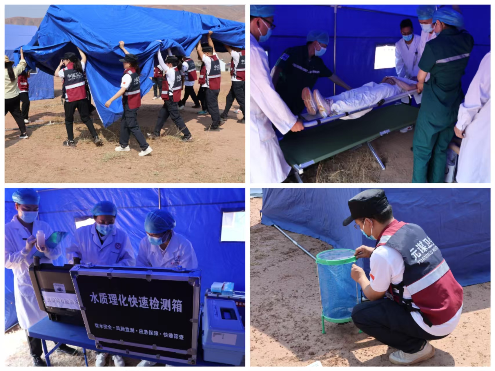 实战演练涵盖野外生存和体能训练等内容,设置应急响应、指挥调度、物资储备、队伍集结、负重徒步、营地搭建、伤员救治、环境消杀、水质检测、病媒生物防制等10个科目。