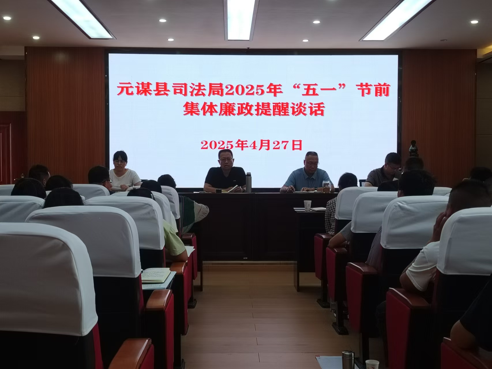 “五一”劳动节临近,为深入贯彻中央八项规定精神,强化全县司法行政系统干部职工廉洁自律意识,筑牢拒腐防变思想防线。近日,元谋县司法局组织开展2025年“五一”节前廉政提醒谈话。局领导班子成员、各股室所负责人及全体干部职工参加会议。通过教育警示、责任传导等方式,为全体干部职工敲响“廉洁钟”、打好“预防针”。