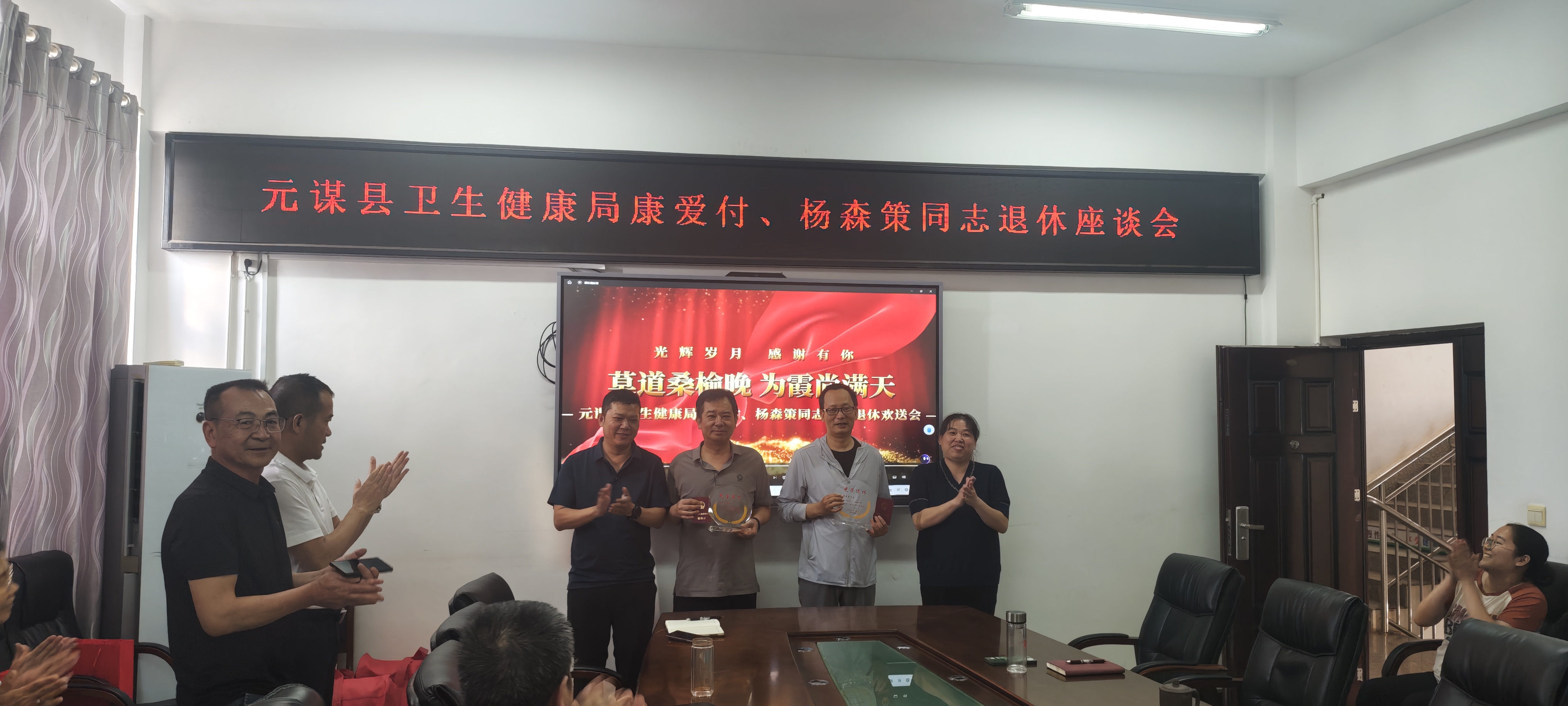见过很多次为同志退休开座谈会,但在一个二十多人的单位为两位同时退休的同志开座谈会的情景还真是少见。5月7日下午,元谋县卫生健康局为4月退休的康爱付和杨森策同志举办了一场庄重而温馨的座谈会。局领导班子成员和干部职工齐聚一堂,共同见证这一温情时刻。