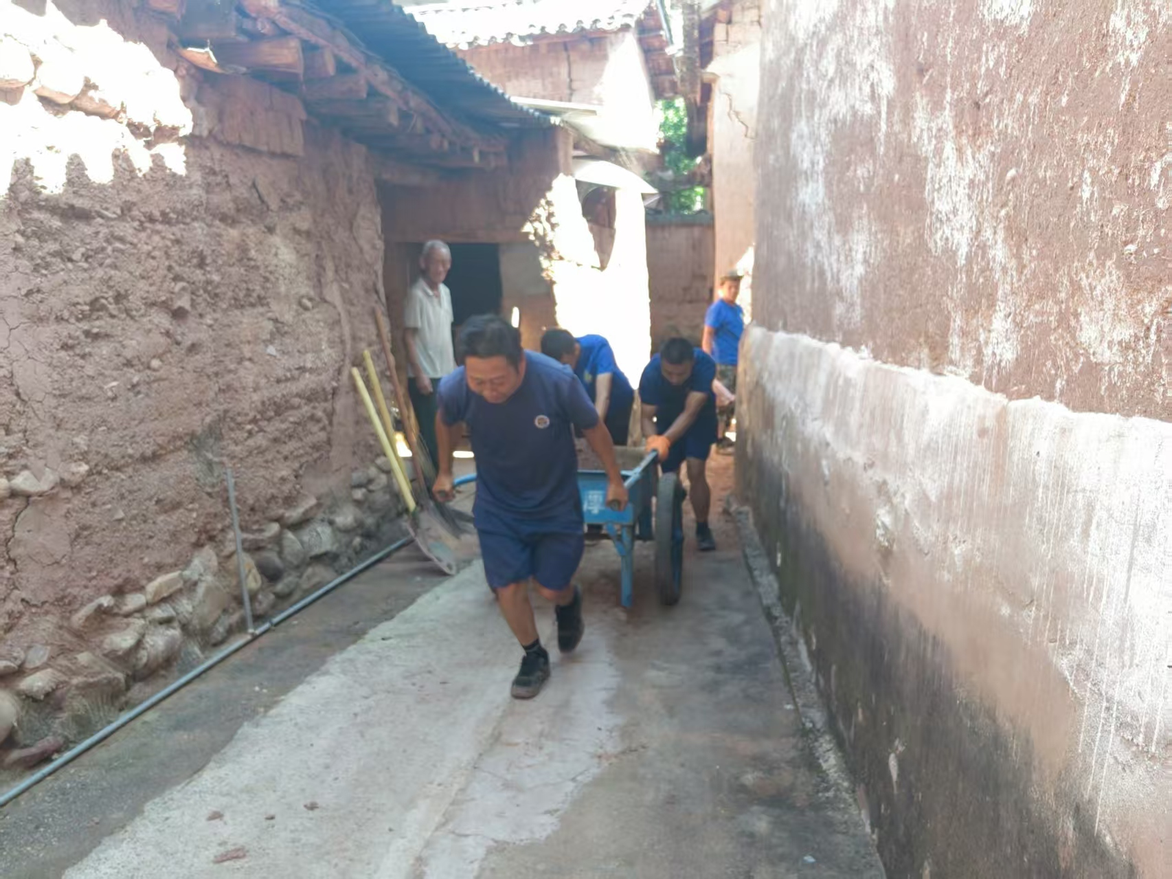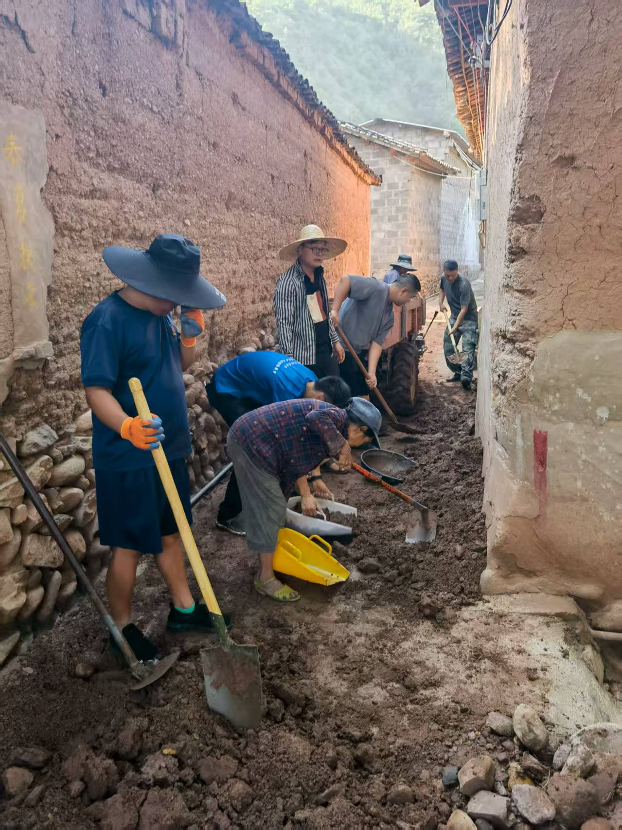 抵达现场后,大家迅速投入到紧张的劳动中。由于村巷道狭窄,大部分泥沙需要人工清理,大家齐心协力,分工明确,有的队员拿着铁锹,一锹一锹地将堆积的沙石铲起,有的则用锄头清理残留的淤泥,还有的队员负责将清理出的泥沙搬运到指定地点,确保道路畅通。