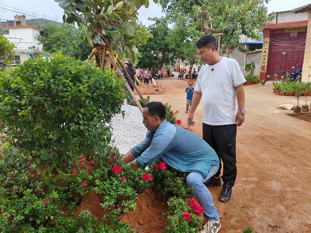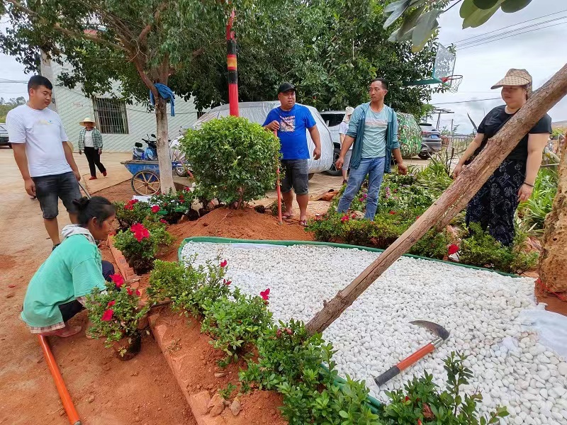 近日,靠着雨水充分的季节,从山里走出来的爱心企业家尹会昌向自己的家乡捐赠26万余元购买绿化苗木、花肥、砂石等,打造美丽那迪村。收到绿化苗木后的爱心企业工作人员和那迪村村民分工协作,搬运树苗、挥锹挖坑、扶苗填坑、设计花台造型、夯土浇水,经过一番热火朝天的劳动,山坳里的小村庄发生了大变样。