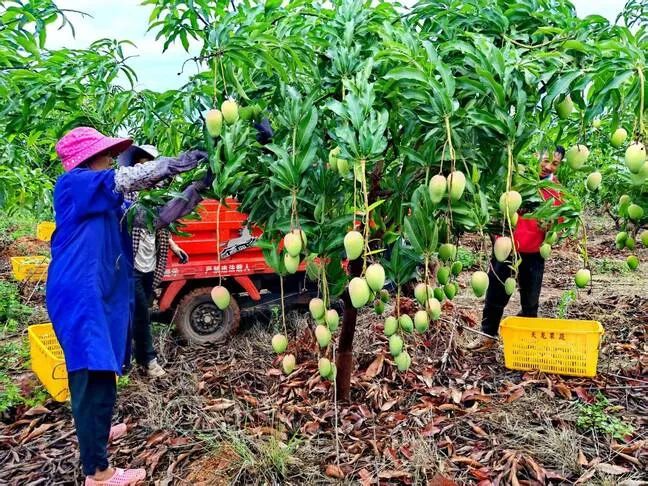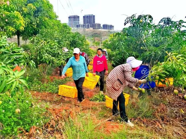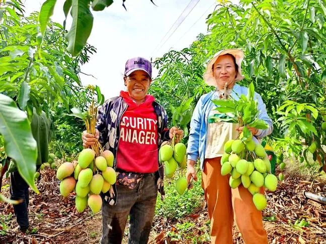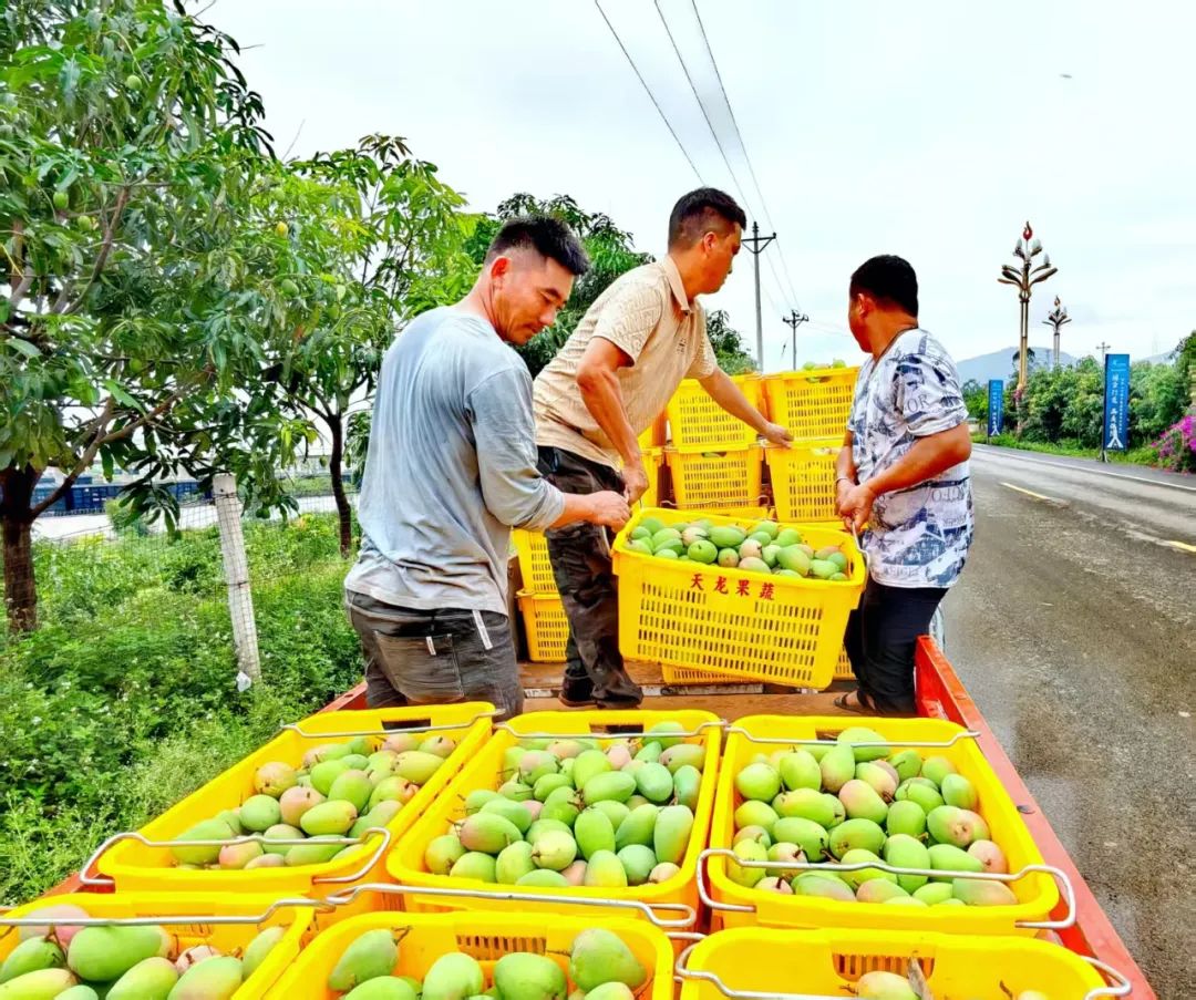 夏日时节,走进元谋县元马镇热水塘村,凤凰山脚下的芒果林绿意盎然,沉甸甸的果实缀满枝头,在阳光下泛着诱人的光泽。微风拂过,浓郁果香扑鼻而来,工人们穿梭林间忙着采摘、装车,一派繁忙的丰收景象。