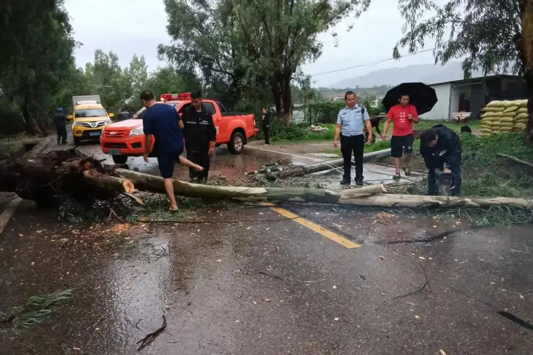 6月25日18时,暮色初合,元谋县黄瓜园镇的天空突然乌云密布,暴雨如注,狂风呼啸而至。在狂风暴雨的“双重暴击”下,108国道牛街沿线,有几棵高大的树木或被连根拔起,或拦腰折断,重重砸落在路面;有几根电线杆也不堪重负,轰然倒塌,供电、通信线路纷纷“罢工”,主要交通干道被彻底封堵,车辆被困,行人止步,对群众的生产生活造成了较重影响。