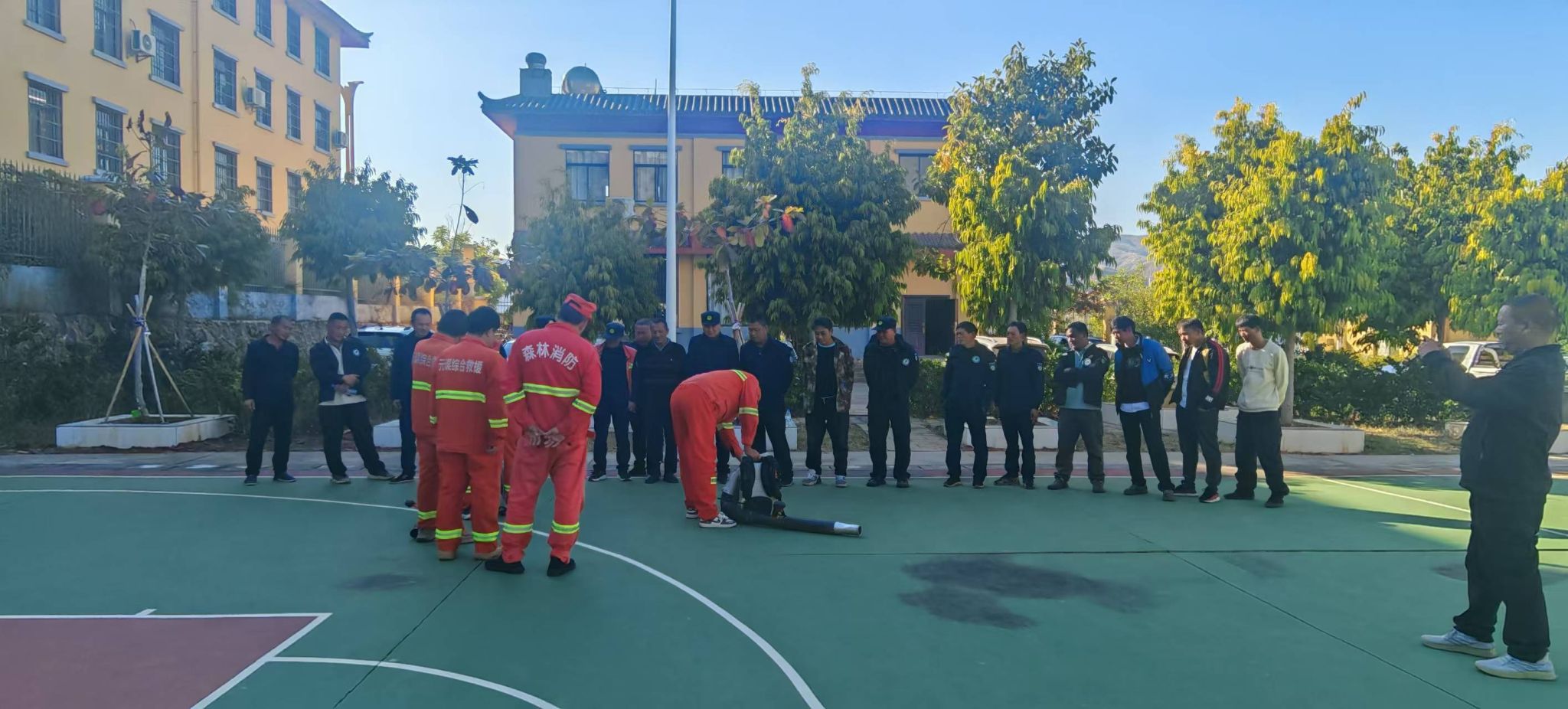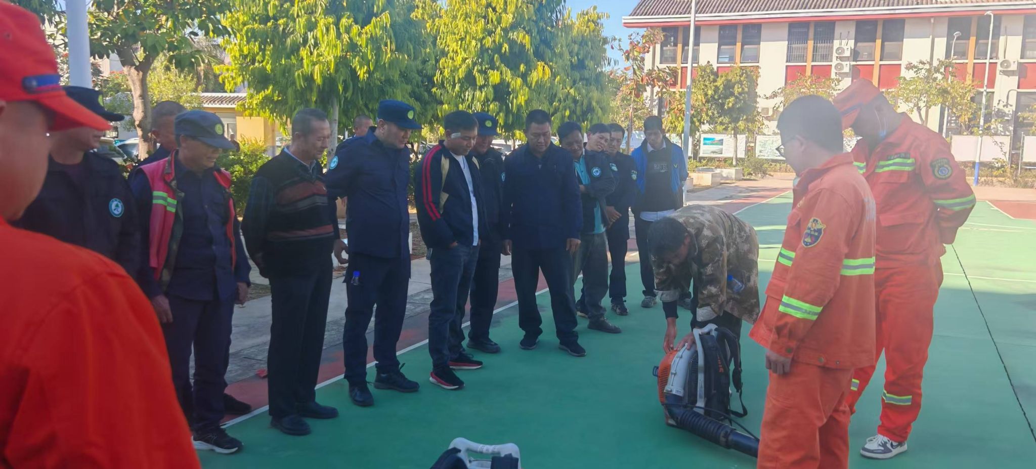 实操演练,提升应急处置技能。理论培训结束后,参训人员移步至指定空旷安全区域,开展了实战化技能操作演练。专业教练现场演示并指导了风力灭火机、油锯、高压细水雾灭火器、二号工具(灭火拖把)等常用扑火机具的规范操作、日常维护保养及故障排除方法。参训人员分组进行了器材使用、扑打火线、协同配合等科目的实操训练。整个演练过程紧张有序,参训人员认真听讲、积极操作,有效掌握了扑火装备的使用技巧和初期火灾扑救的基本战术,提升了在紧急情况下的实战能力和团队协作水平。