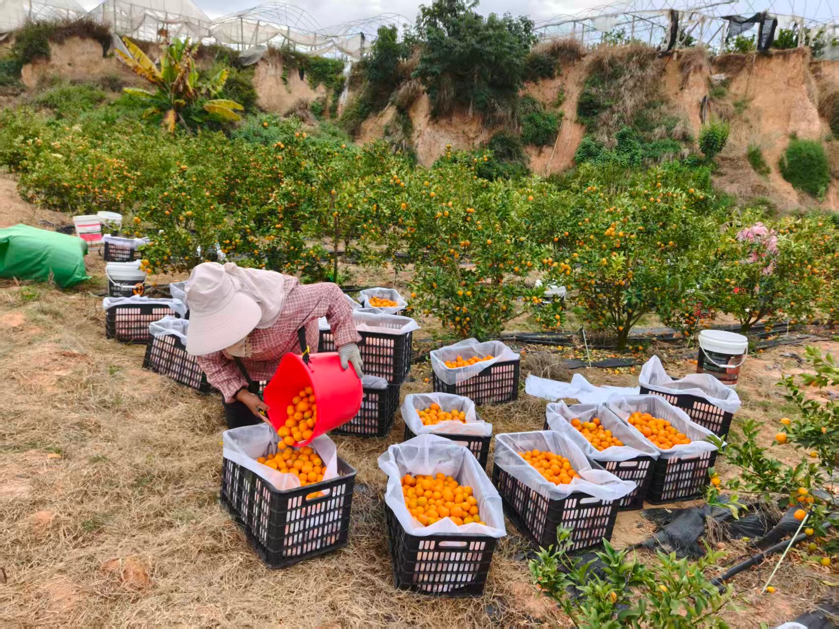 走进滇宇农业种植基地,一颗颗金灿灿的金桔挂满枝头,工人们穿梭在果树之间,采摘、分拣、装运,一气呵成。