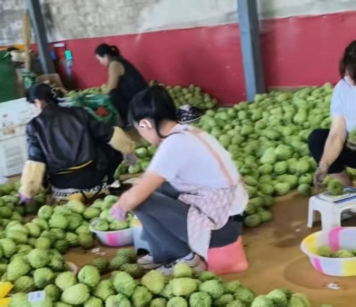 每年1至3月,是丙桂村释迦果成熟上市的黄金季节,也是村民们最忙碌、最幸福的时候。田间地头,采摘的欢声笑语此起彼伏;村里的收购点,两位长期驻扎的老板忙着收购,分拣、装车,一派繁忙景象。为了卖到更高的价钱,有的村民也会自己驾车,把新鲜的释迦果拉到元马镇能禹蔬菜交易市场售卖;罗建波则另辟蹊径,对接外地经销商让丙桂村的释迦果通过合作商直销到全国各地。为了应对市场价格波动,他还建起了冷库,将释迦果冷藏保鲜,待价格回升时再出售,为村民们的收入上了“双保险”。今年,丙桂村的释迦果均价稳定在10至20元一公斤,优质果更是卖到20多元一公斤,实实在在的收益装进了村民的腰包。