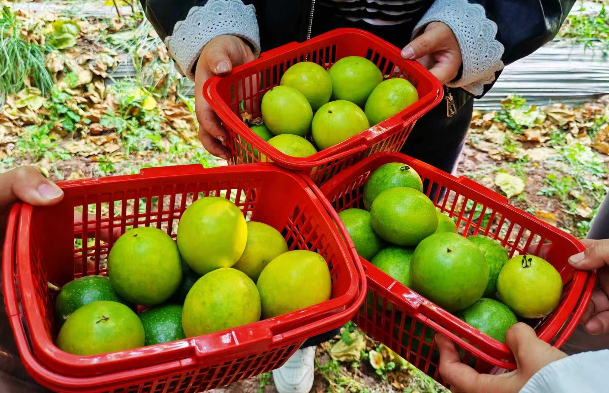 在百香果采摘园里,游客正在采摘百香果。“工作之余来果园采摘,闻着百香果的清香,现场品尝清甜多汁,还能带回家加蜂蜜泡水,体验感特别好,心情也格外舒畅。”采摘的游客说。