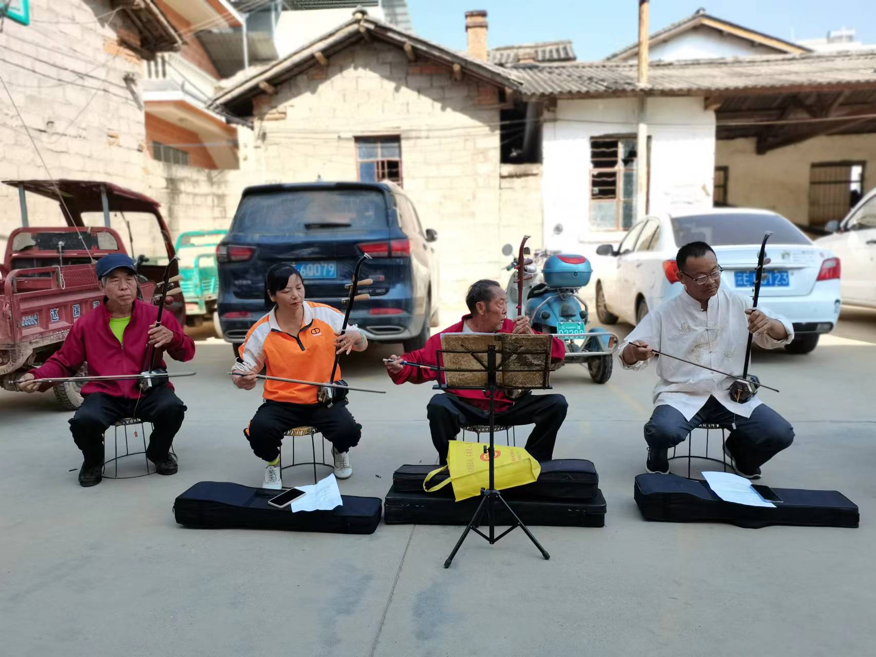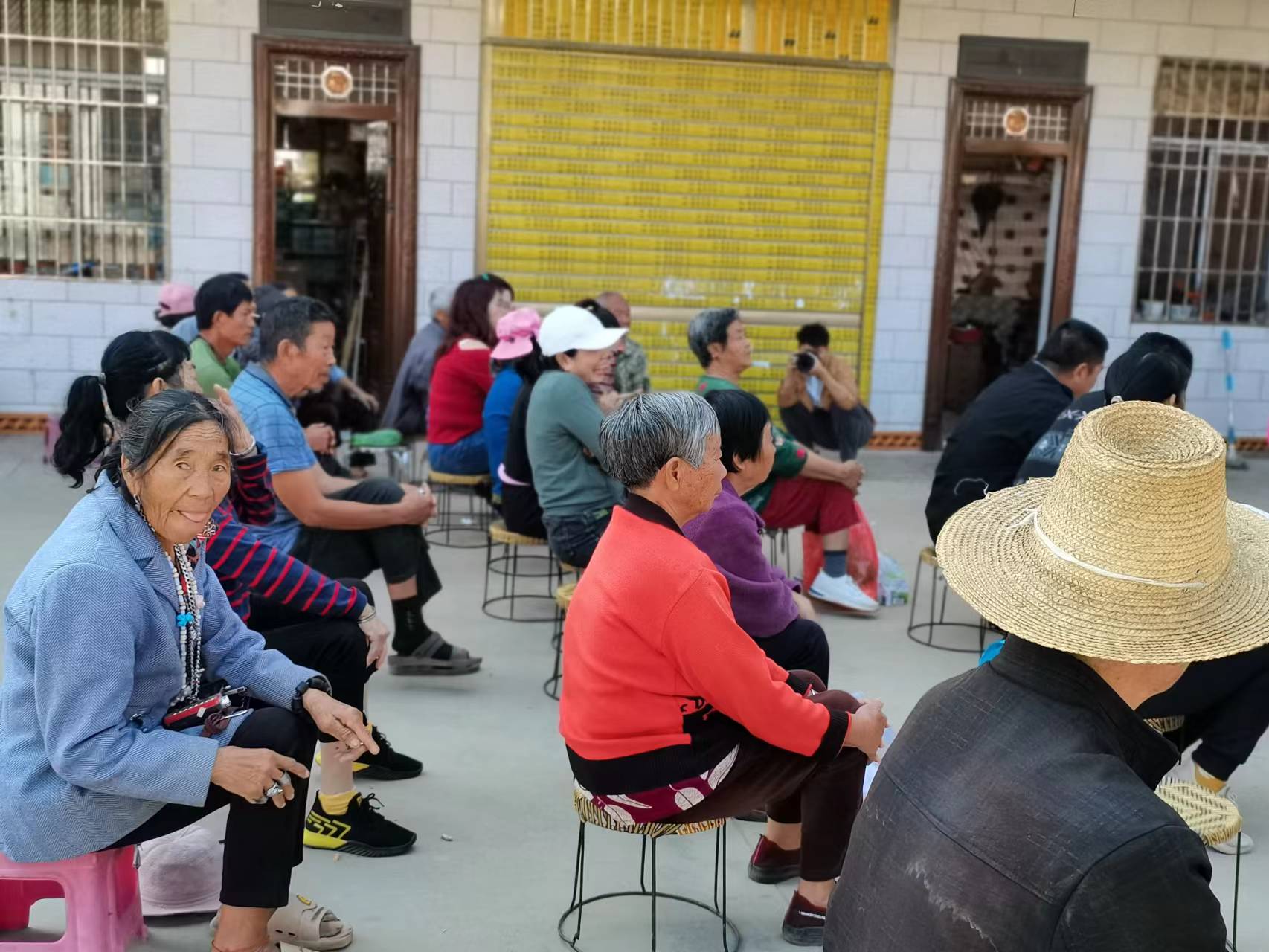 午饭过后,在元谋县黄瓜园镇苴林小村活动广场,男女老少齐聚一堂,元谋县苴林艺渊花灯社正在义务为群众表演花灯歌舞《二十大精神放光芒》。