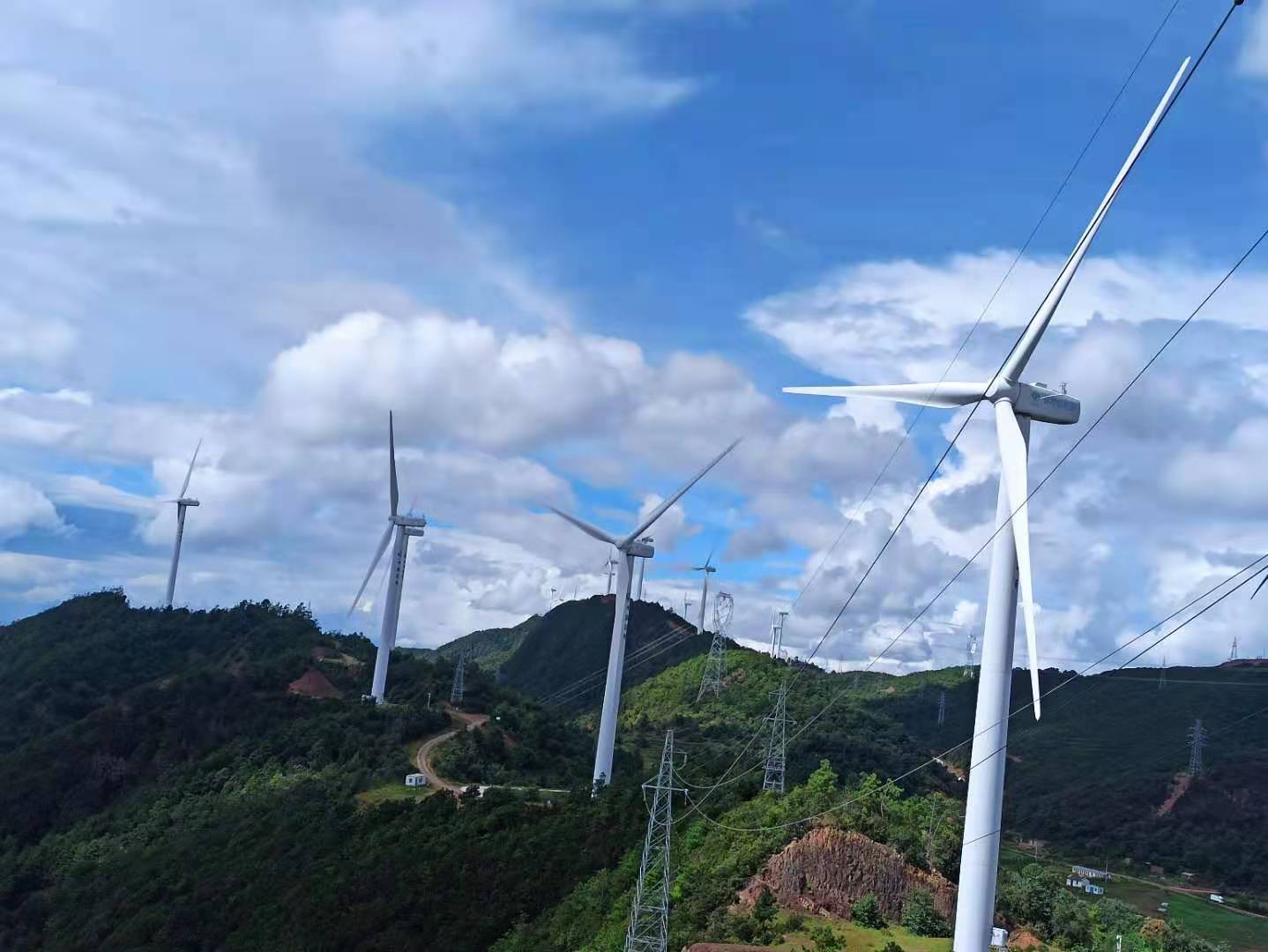 风力发电吱吱旋转,远山含黛,秋日的元谋县凉山乡冷水箐村风景如画。