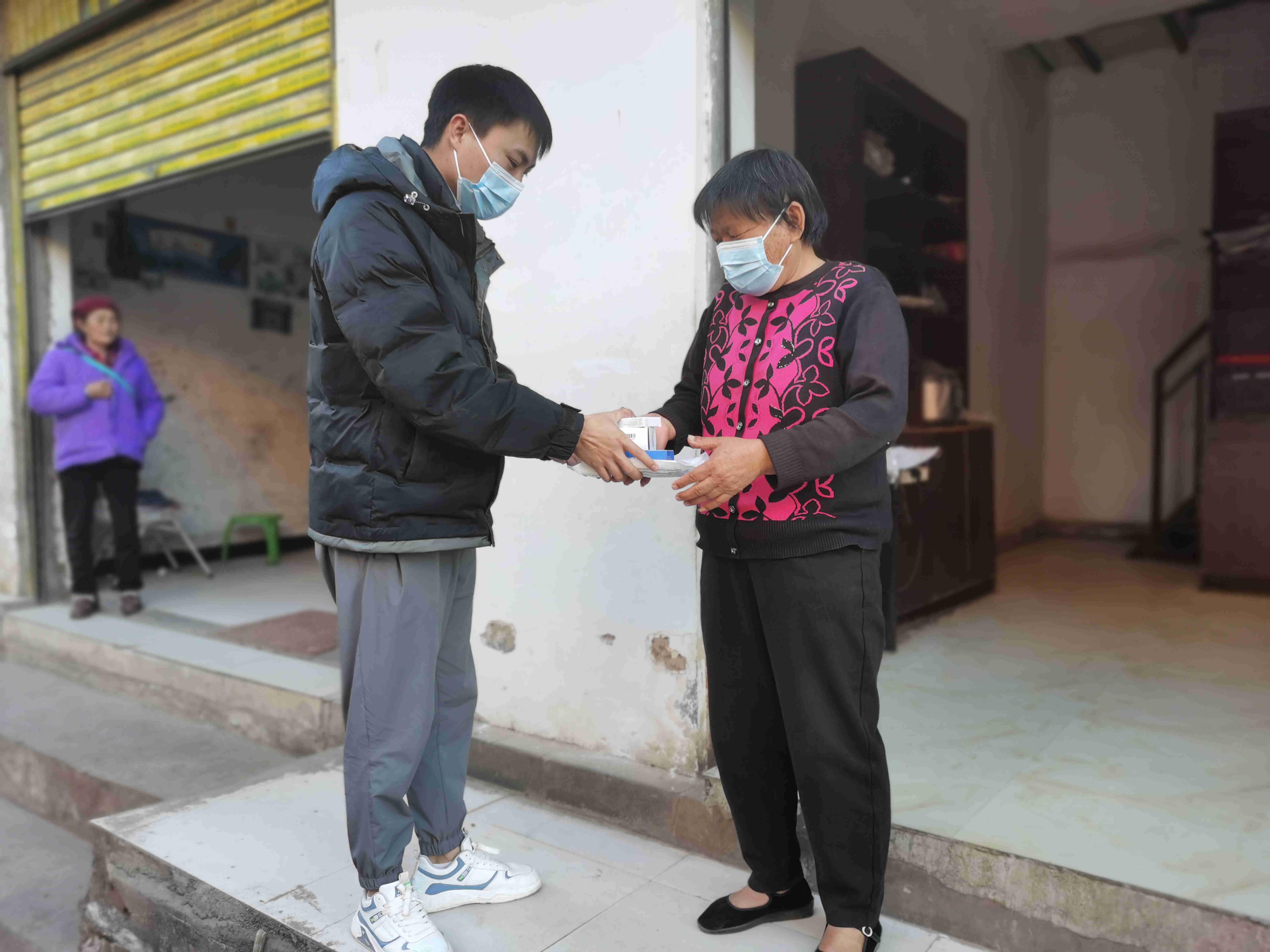 “大爹,里面有4种药,这个是镇咳祛痰的,咳嗽有痰时候吃,一天吃3次,一次1片就行了,用药说明袋子里也有,如果记不得就直接打电话给村干部,我们都会教你怎么吃......”金雷村委会工作人员普金丽一边发放药品,一边向群众耐心地讲解药品用法和注意事项,并嘱咐大家对症用药,必要时就医。前来领取药品的老人虽佩戴着口罩,但脸上的激动和欣喜却难以掩藏。