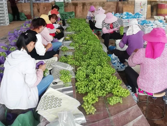 阳春三月末,元谋县老城乡丙月村委会的水晶葡萄最先熟了,在丙岭哨村民小组村口牌坊前,只看见长廊下,果农们喜笑颜开,围坐着给刚采摘的鲜葡萄剪枝、装篮、封箱,为销往全国各大中城市做准备。