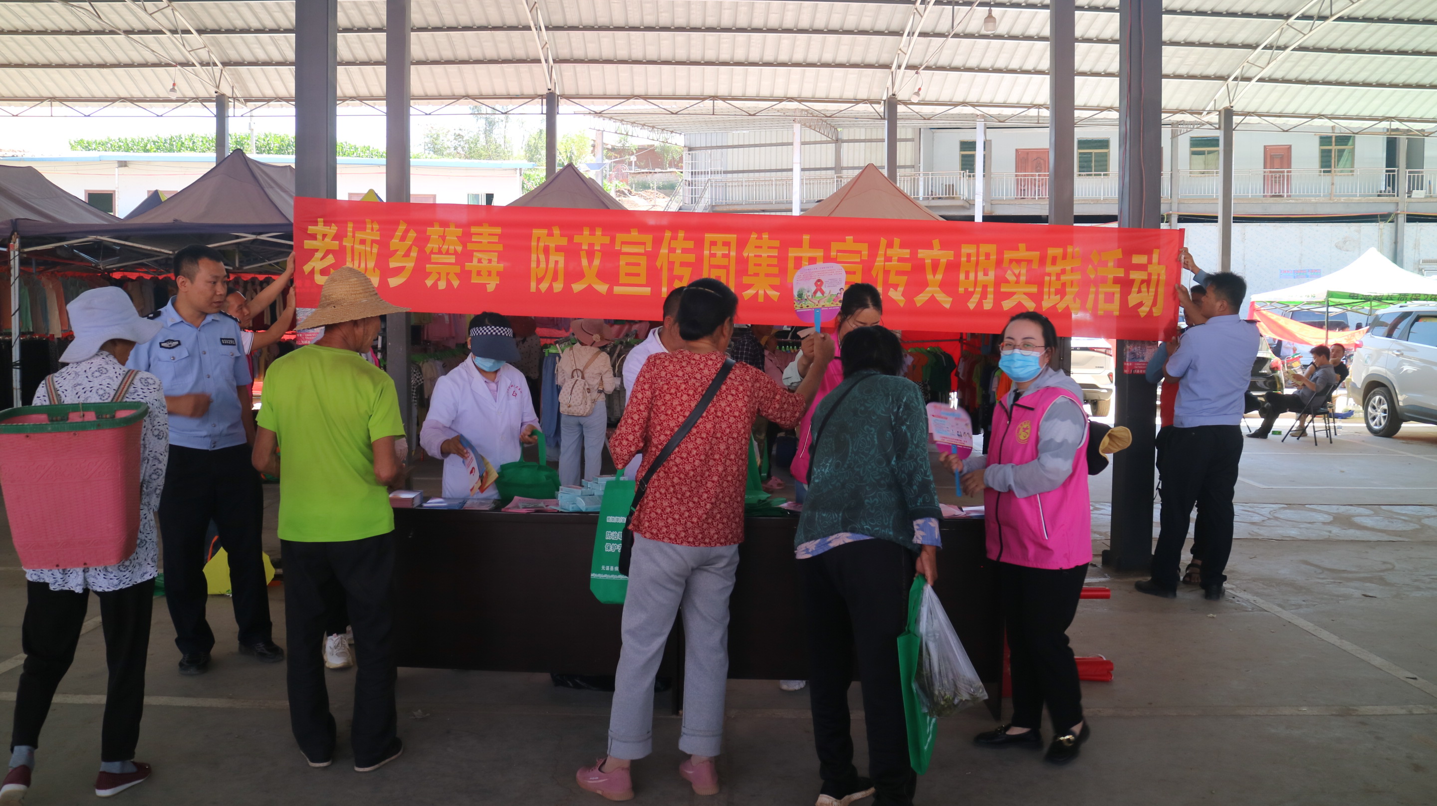 近日,老城乡新时代文明实践所利用乡集镇赶集日组织乡综治中心、司法所、派出所、国安办及卫生院志愿者14人,在集贸市场开展以“拒毒防艾 珍爱生命 共享健康”为主题的禁毒防艾集中宣传志愿服务活动。
