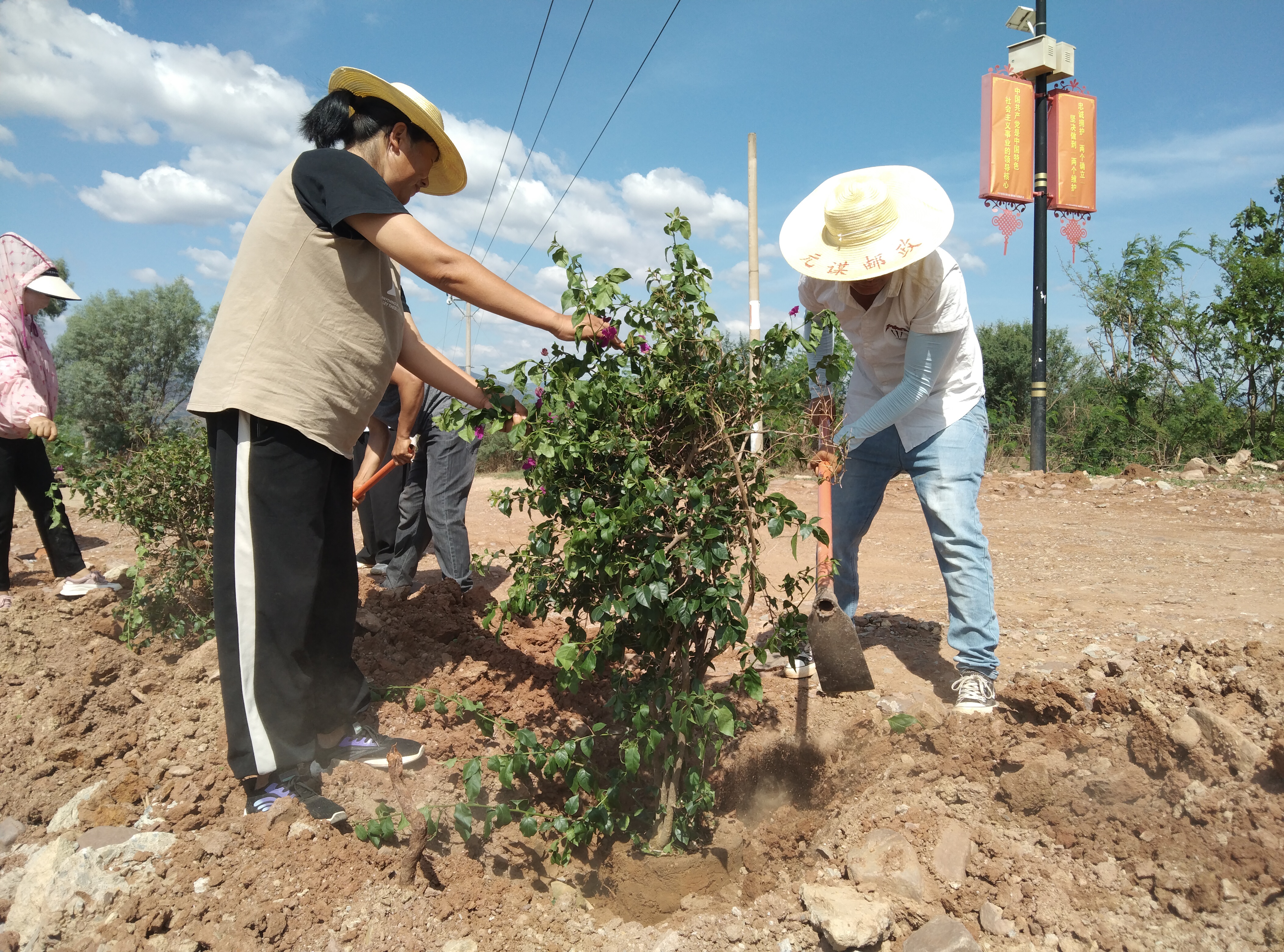 大家分工协作、密切配合,头顶烈日挥锹挖坑、扶正苗木、踏土固根、提桶浇水,交替移栽种植三叶花和鸡蛋花,对老城乡政府至108国道岔口段的公路两侧裸进行植绿补绿,现场呈现一片热火朝天的繁忙景象。经过一上午的辛劳,共种植三叶花、鸡蛋花苗680株,一棵棵新栽种的苗木迎风舒展,生机盎然。
