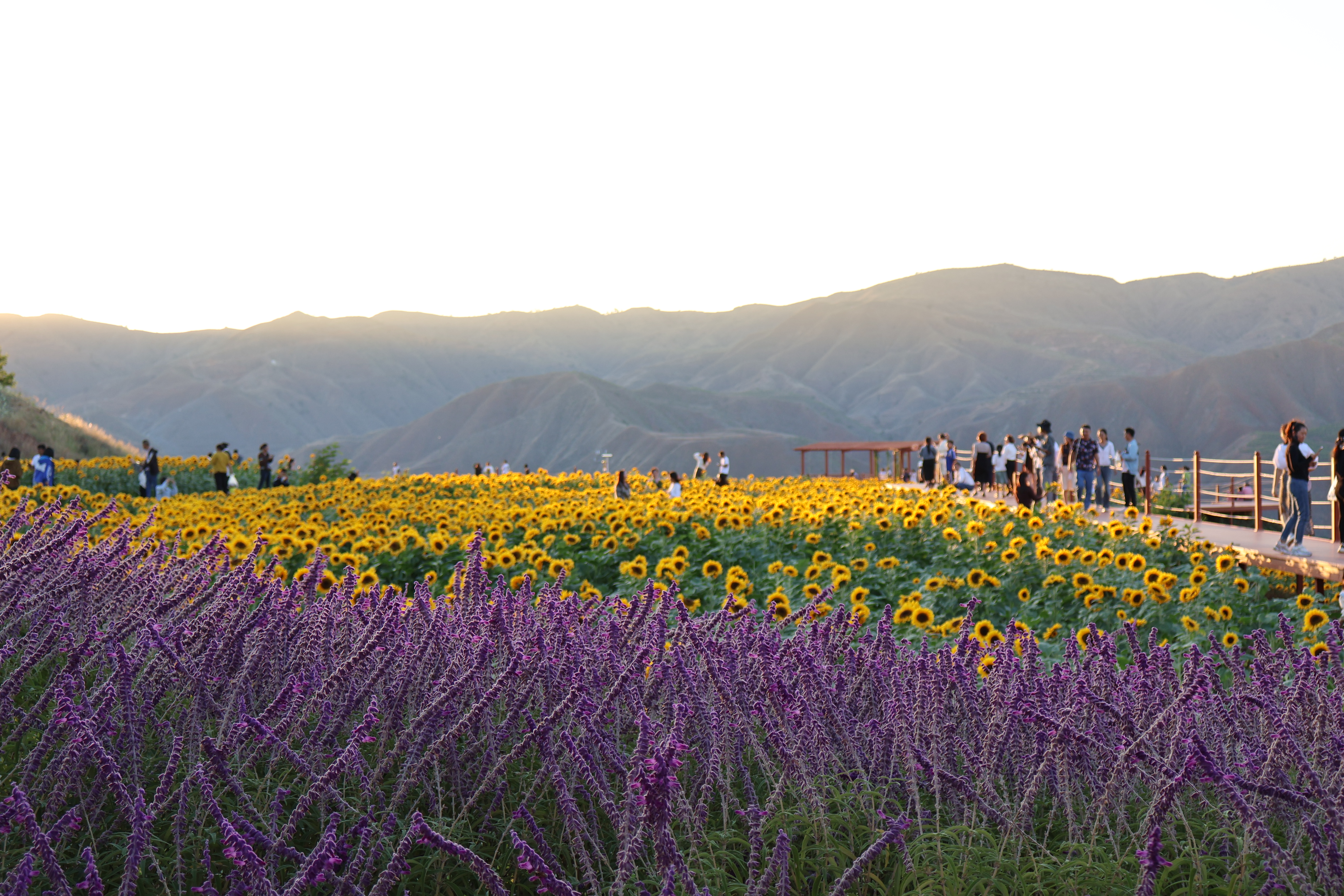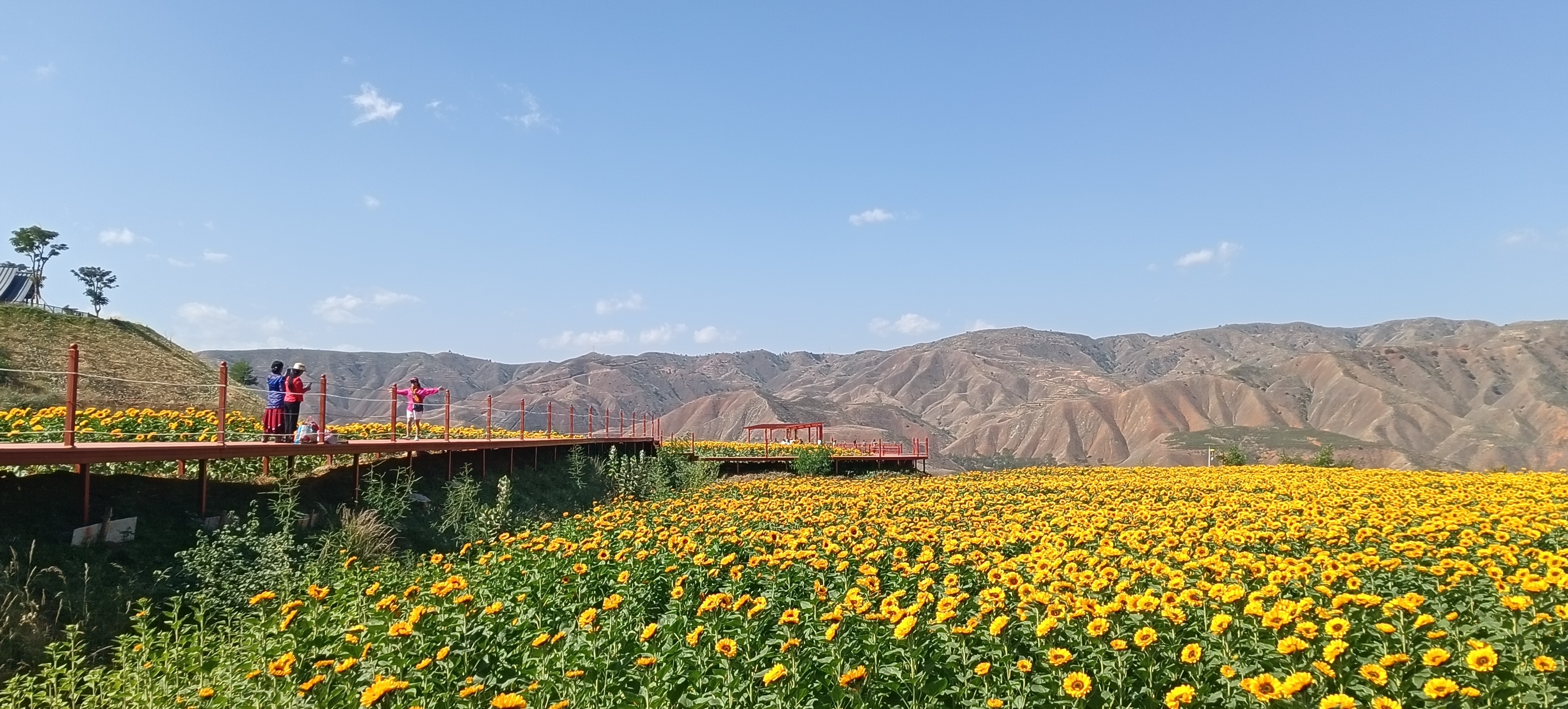 金黄色的向日葵让秋天更加明媚鲜亮,远处是蓝天、碧水和险峻的山峰,近处是青瓦、白墙和金色的花海,随手一拍就是“出圈”的美图。徜徉在向日葵花海中,远离城市的喧闹,让心情豁然开朗。