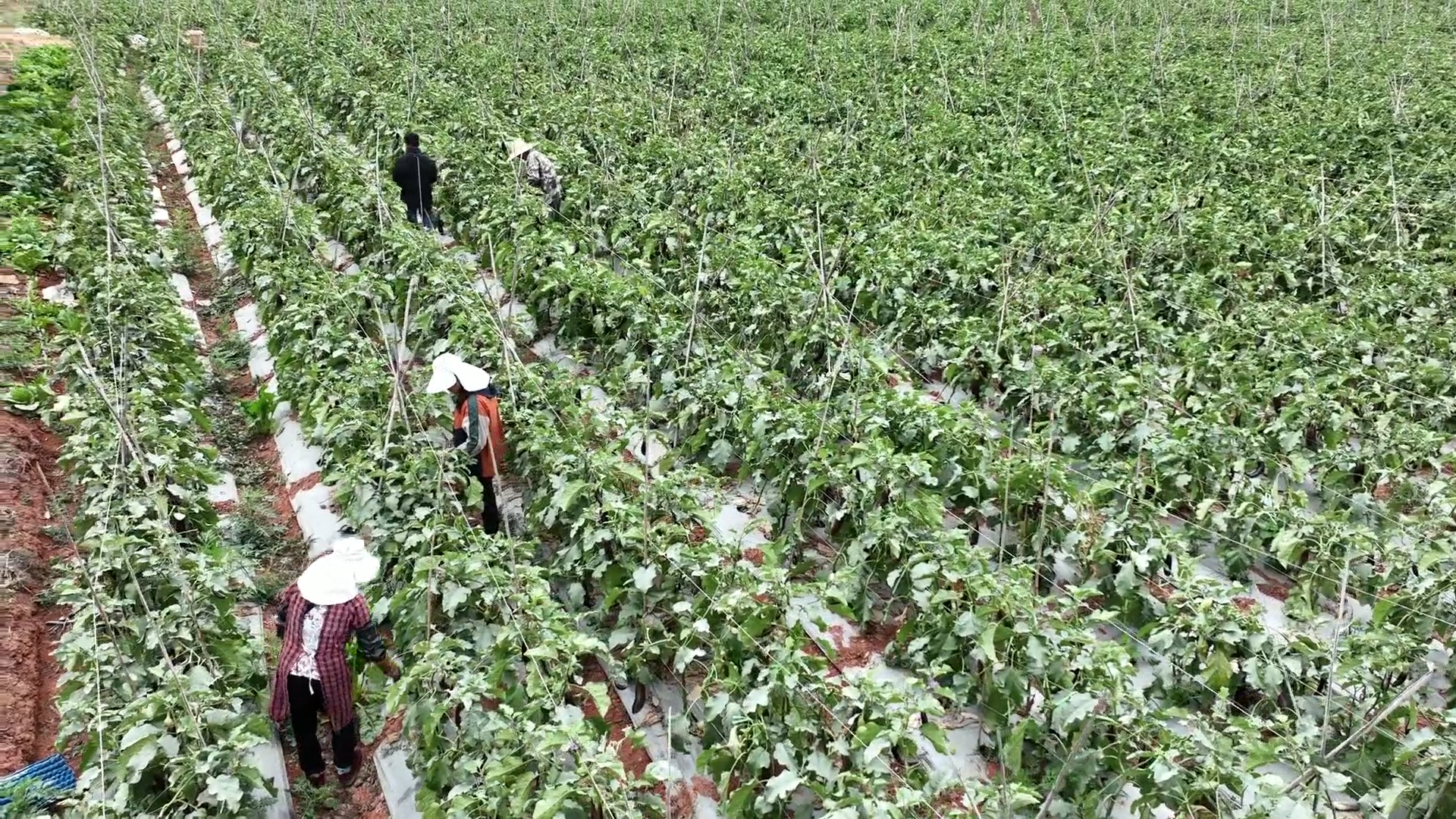 走进物茂乡物茂村委会龙潭村的蔬菜种植基地,紫红的茄子挂满了枝头,一行行、一株株排列着,个个圆润饱满、长势喜人。种植户起加江和几个村民穿梭在1米多高的茄子架中,挑选着个大、光滑的茄子,熟练地用剪刀剪下装到篮子里。